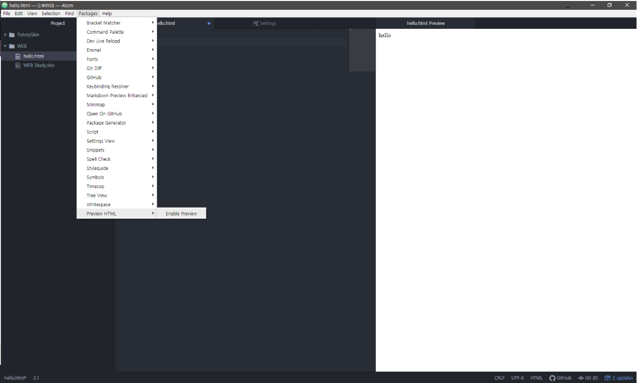 - Menu바 Packages->Preview HTML->Enable Preview를 클릭하는 방법