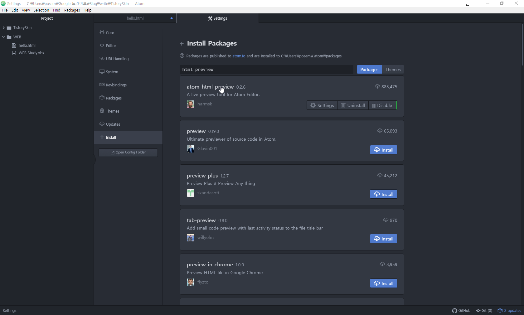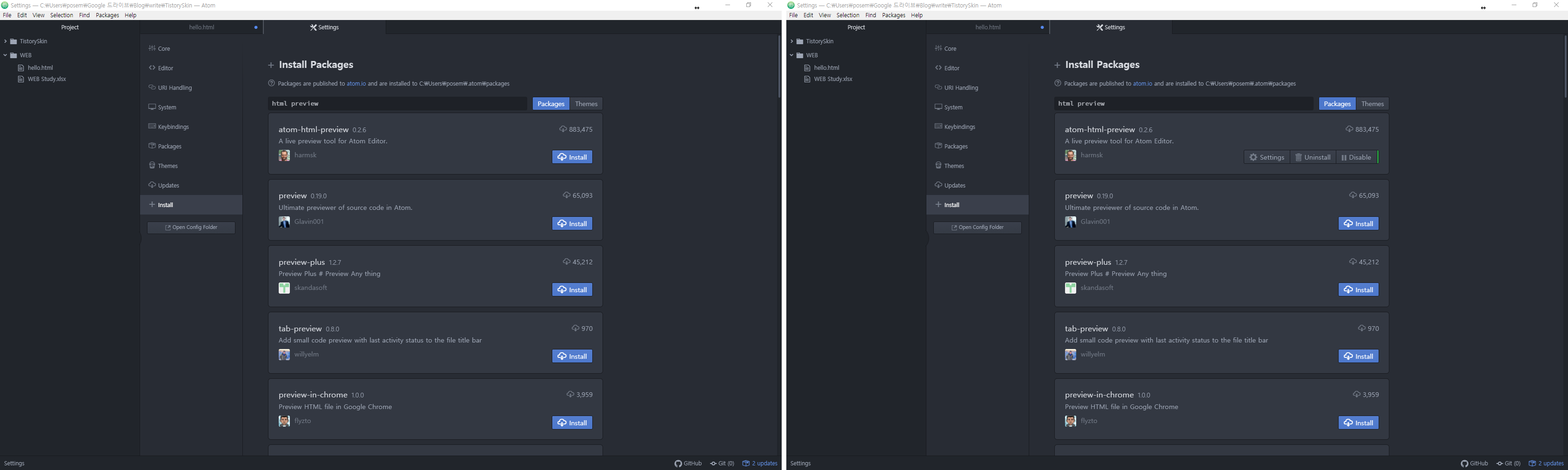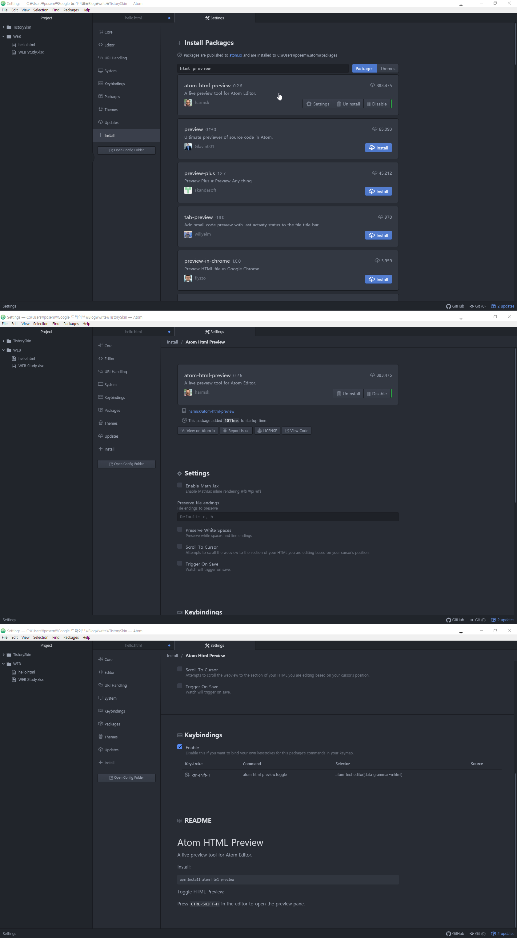 그래서 저도 망설이지 않고 atom-html-preview를 install 하였습니다.