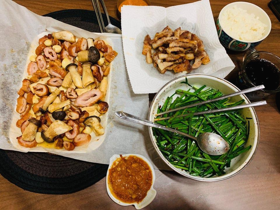 저희는 이렇게 우여곡절 끝에 맛있는 저녁으로 삽겹살과 '에어프라이어로 한 피콕포차 훈제막창'을