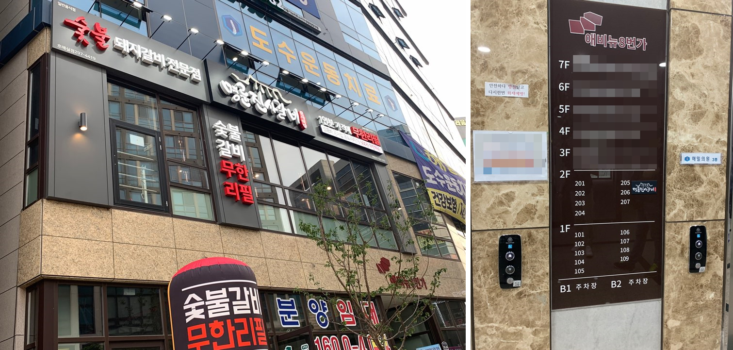 지도 위에 표시된 에비뉴 8번가 건물 이층에 있어요.