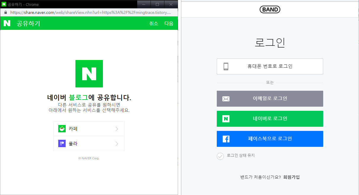 좌측 네이버 공유(포스트는 없어진듯 합니다), 우측 밴드 공유