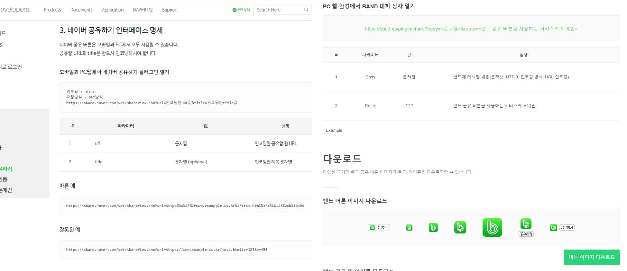 https://share.naver.com/web/shareView.nhn?url=인코딩한URL값&title=인코딩한title값https://band.us/plugin/share?body=<문자열>&route=<밴드 공유 버튼을 사용하는 서비스의 도메인>