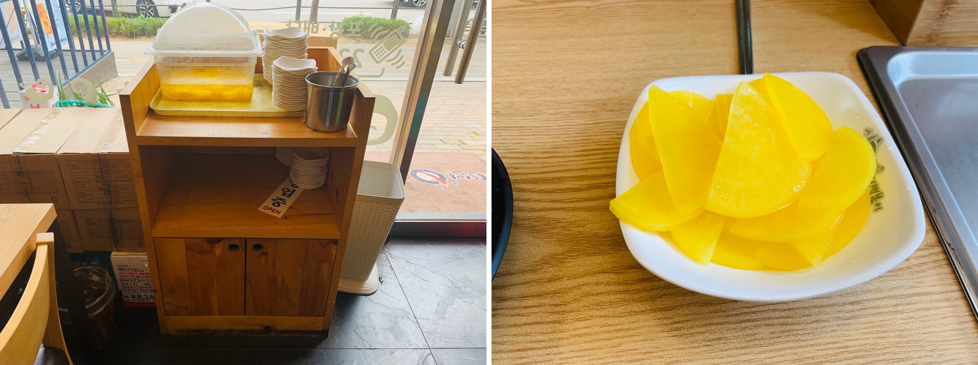 그리고 단무지와 물을 떠 놓고 기다렸죠.