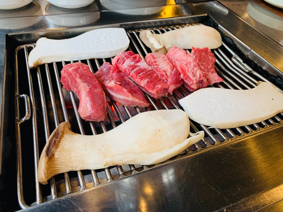 일단 새송이버섯과 생갈비를 얹어서 굽기 시작했어요.^^