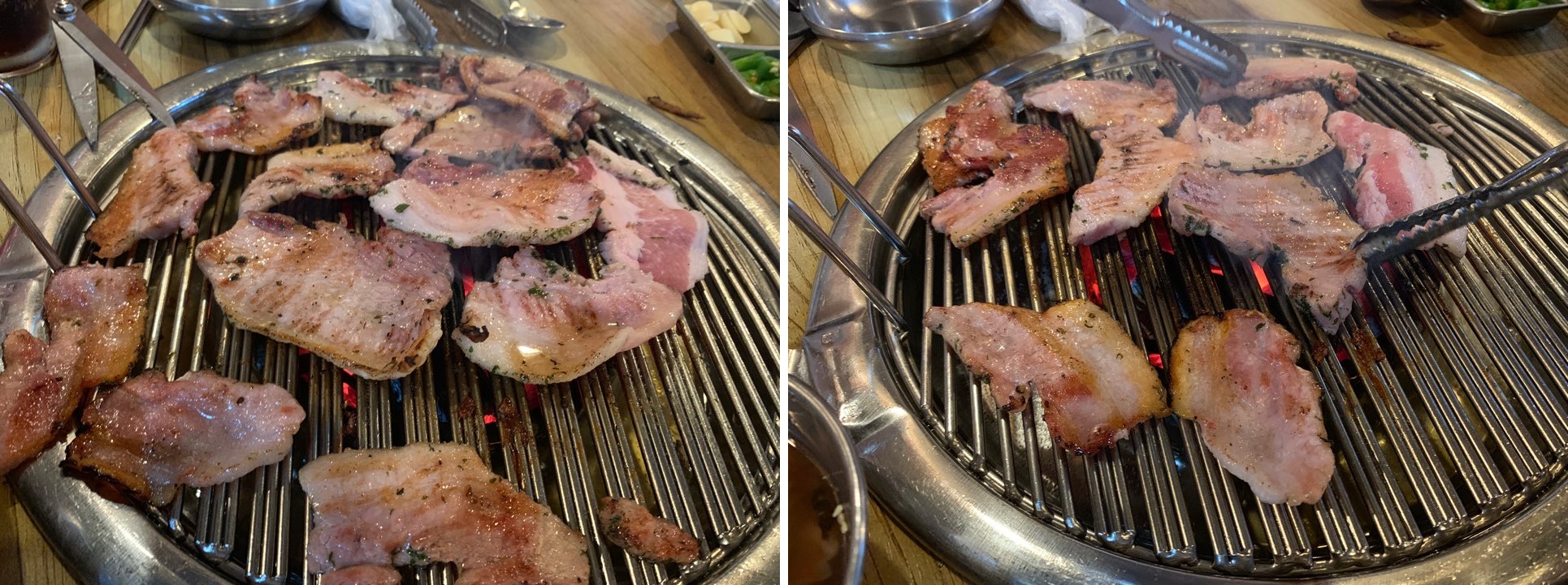삼겹살과 등갈비는 불판이 달라서 불판을 바꾸고 얹었주고, 뼈끼리 나누어 줘요.