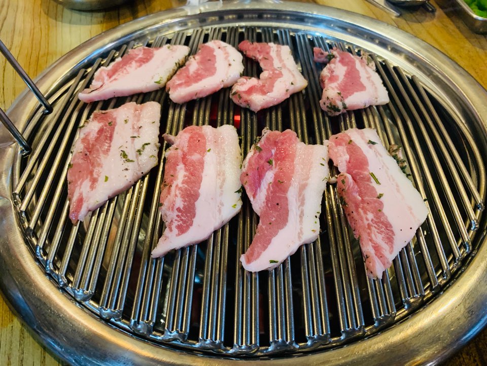 배도 고프고, 세 분도 마저 오시고 해서 삼겹살 추가하고 빠르게 굽기 시작했어요. ㅎㅎ