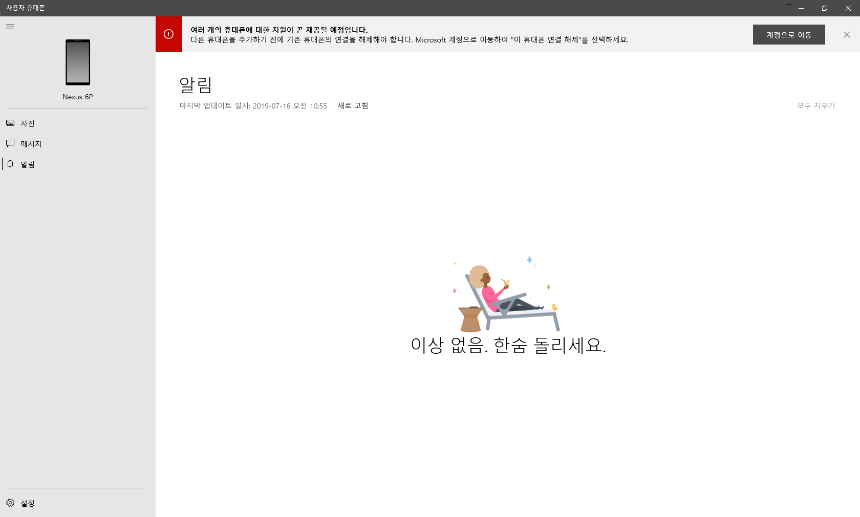 알림 탭에서 '이상 없음. 한숨 돌리세요' 문구가 나옵니다.