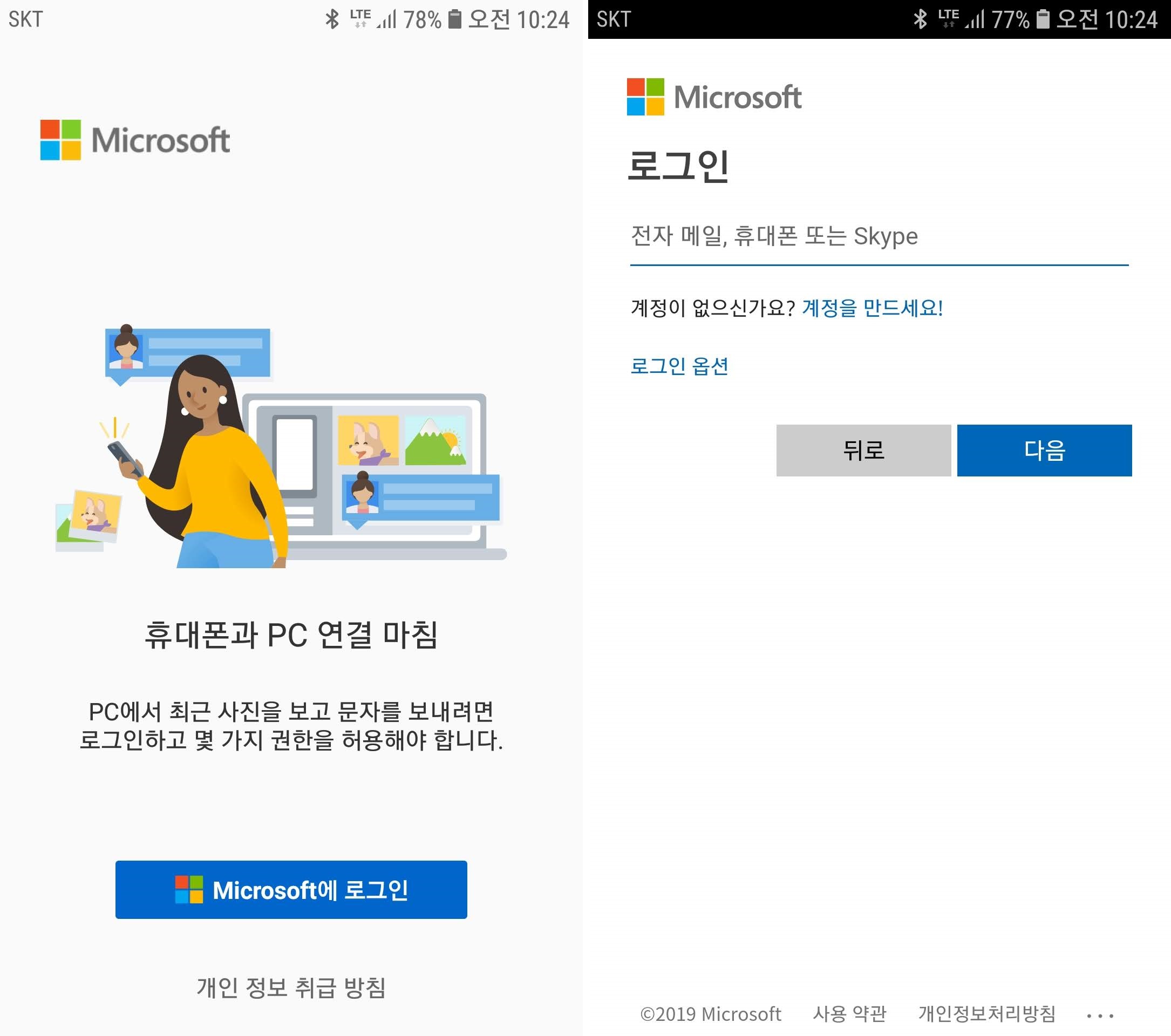 그리고, Windows 10 PC에서 로그인되어 있는 Microsoft 계정과 동일한 계정으로 로그인을 해줍니다.