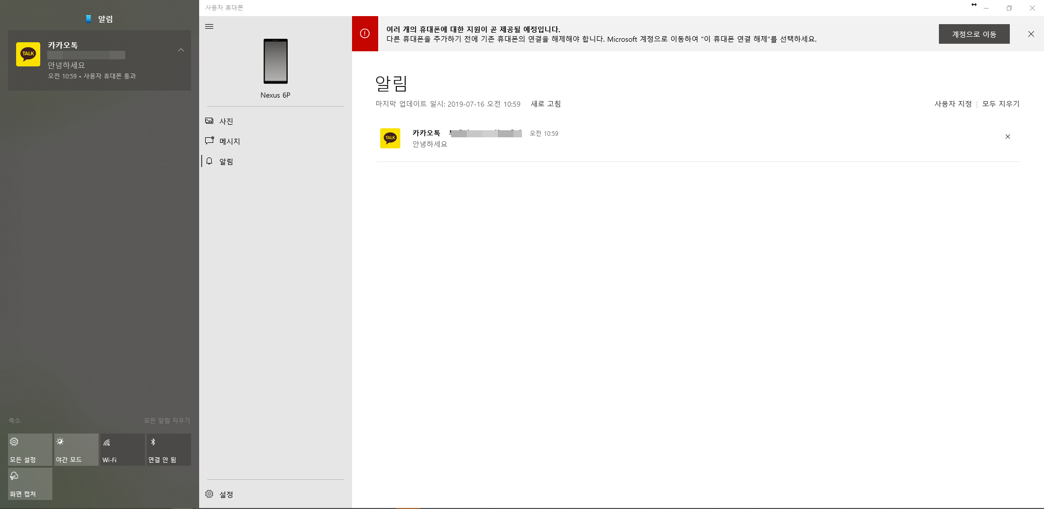 Windows 10 알림 창에서도 알림과 메시지가 나오는 것을 확인했습니다.
