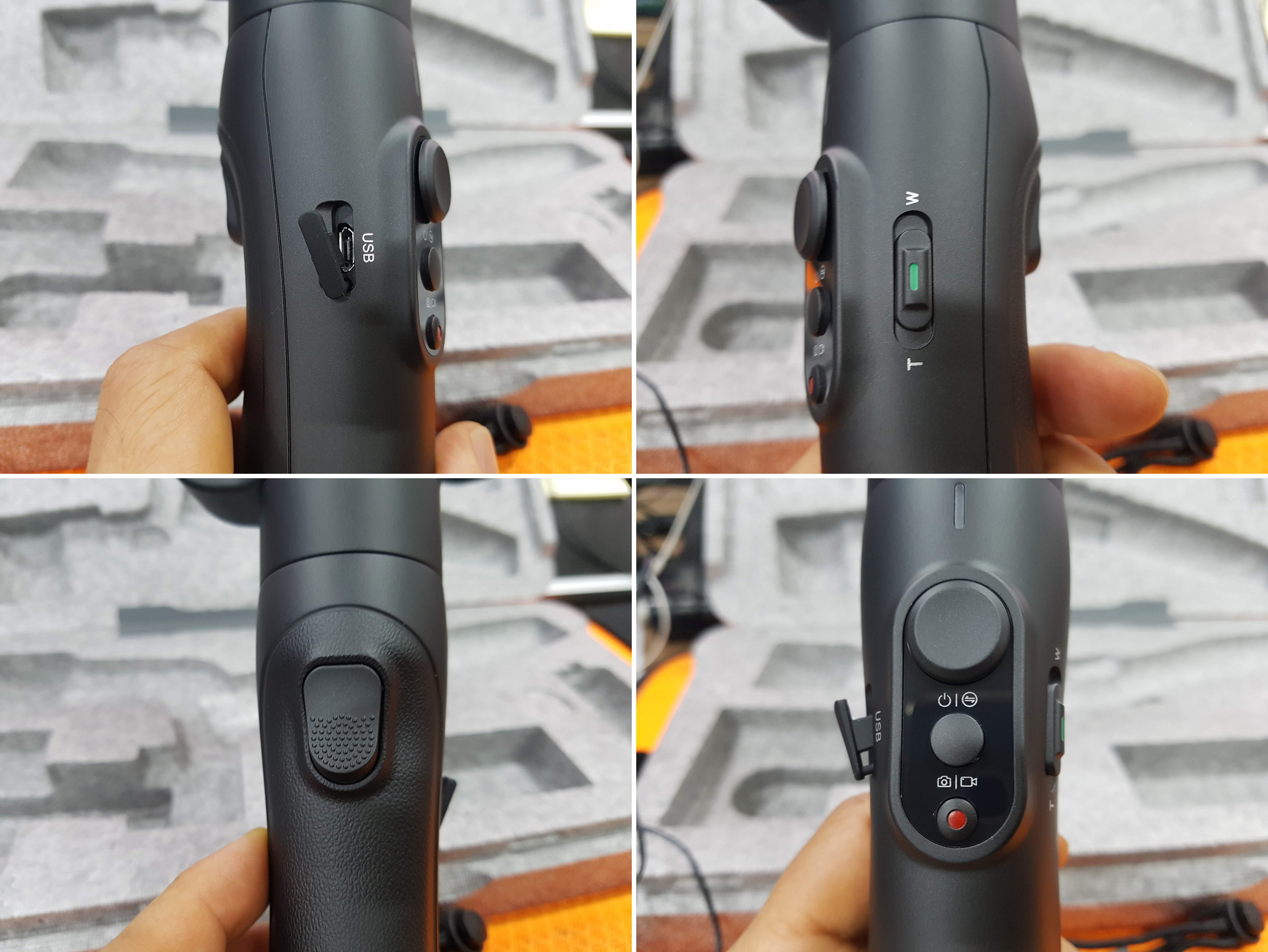 뒷면에는 트리거 버튼이 있어서 짐벌을 움직여도 화면이 한 방향을 볼 수 있도록 고정시켜 주고요,