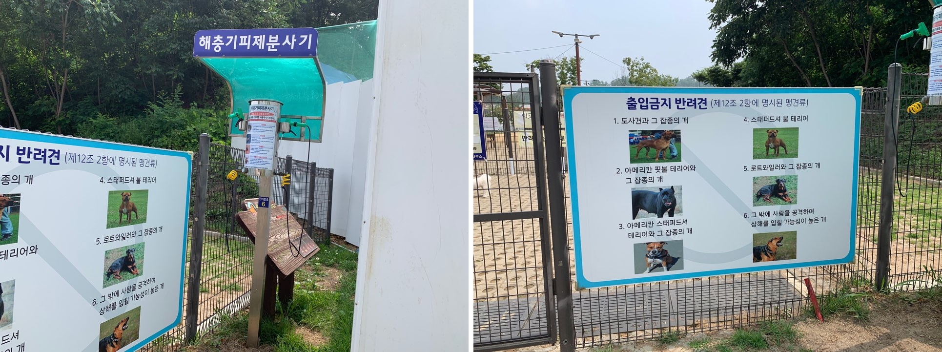 입구에 들어가기 전에 회충 기피제와 출입금지 반려견에 대한 안내 팻말이 있어요.