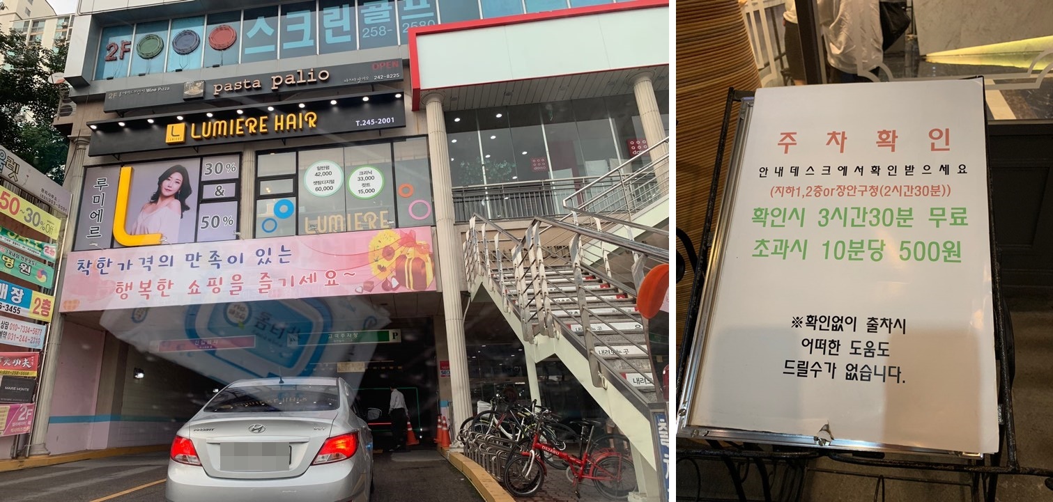 건물 주차장을 이용할 수 있고, 주차 확인을 받으면 3시간 30분 무료예요.