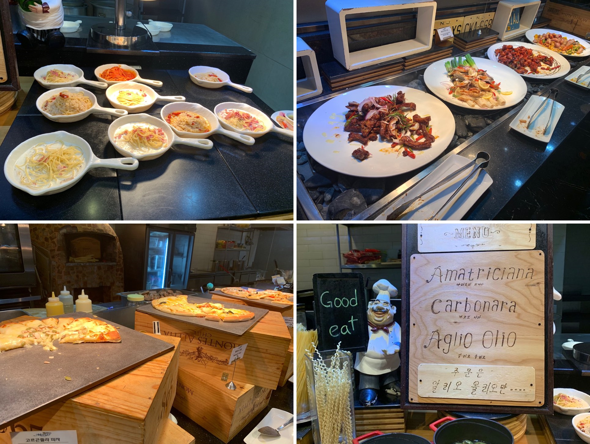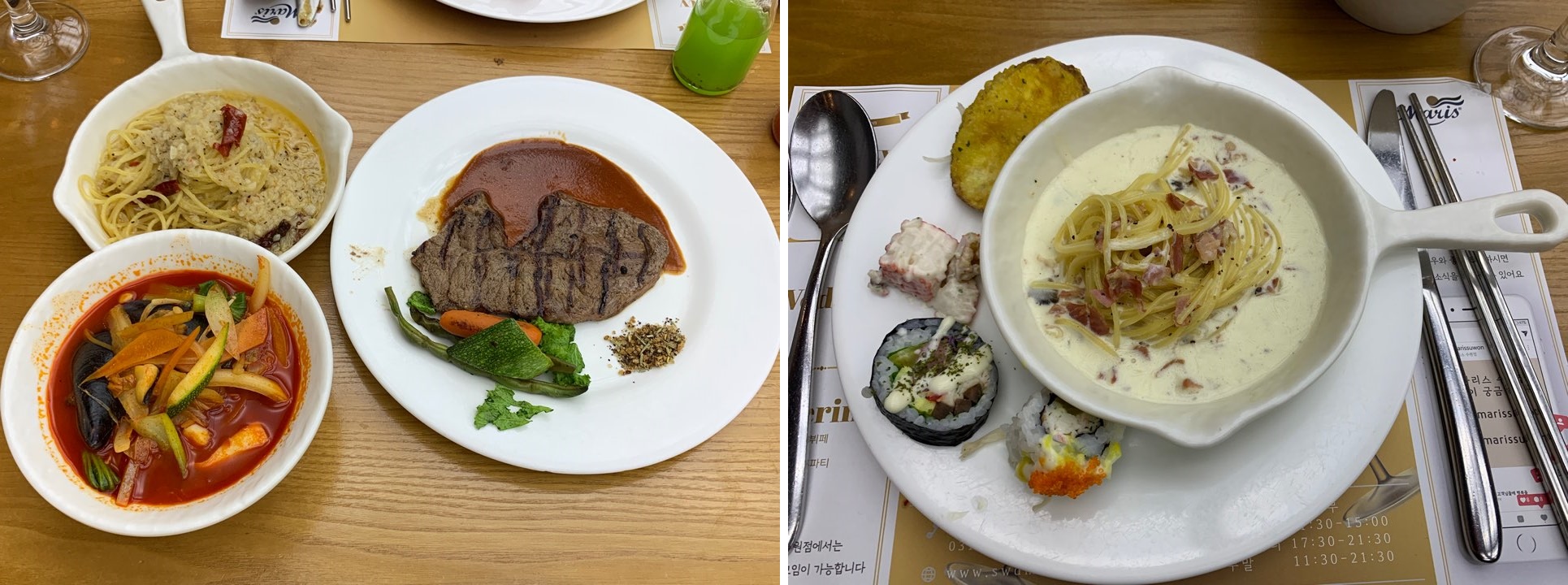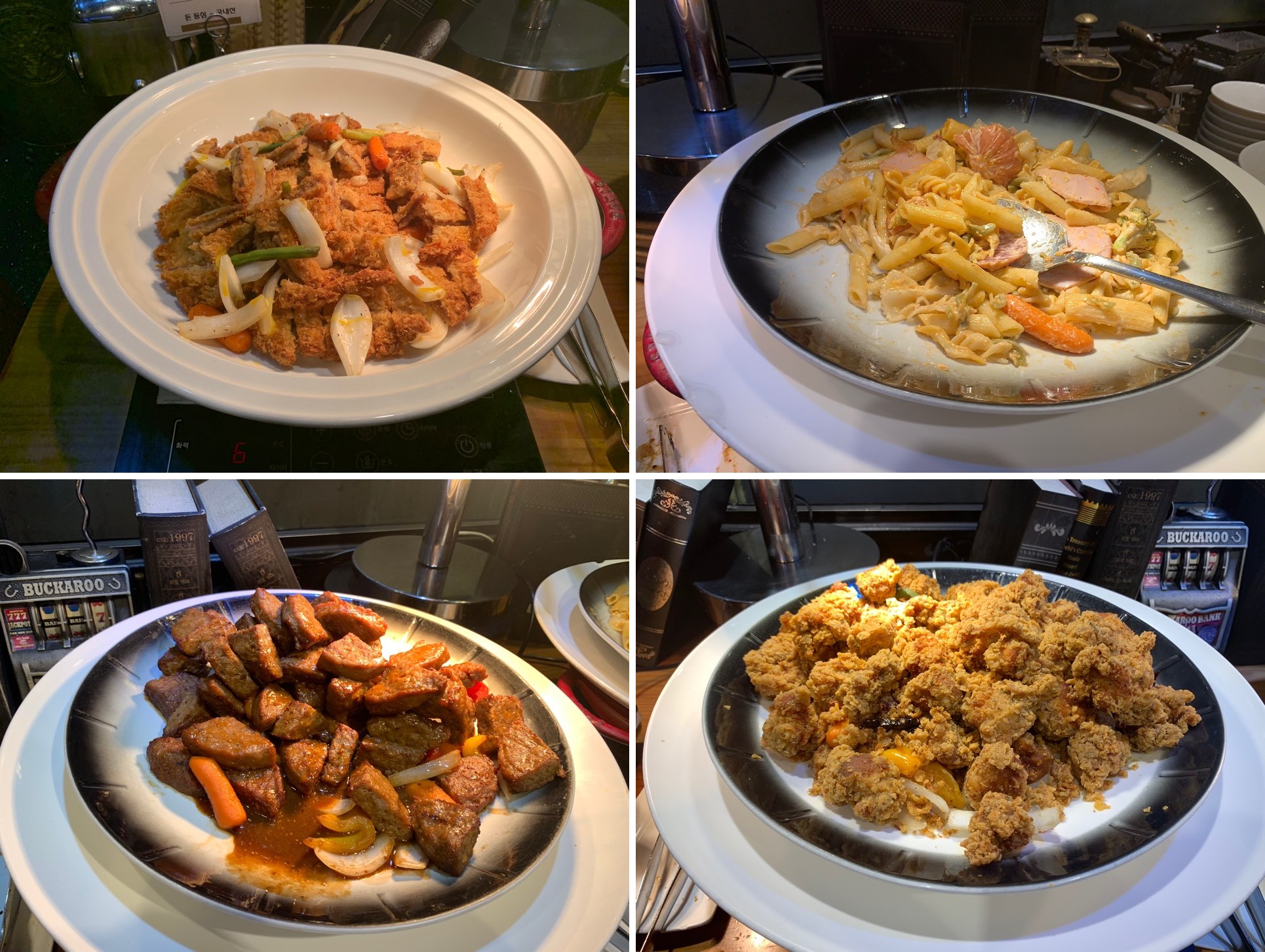 알리오 올리오 파스타와 크림 파스타, 짬뽕 그리고 스테이크를 한번 더 가져왔어요. ㅎㅎ