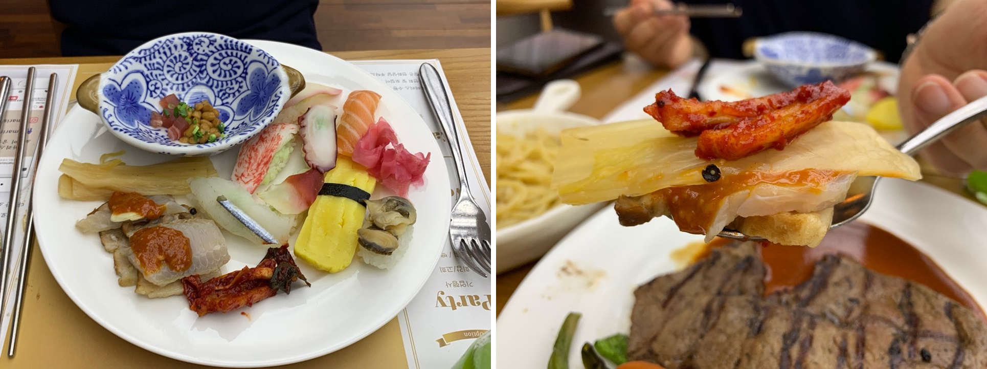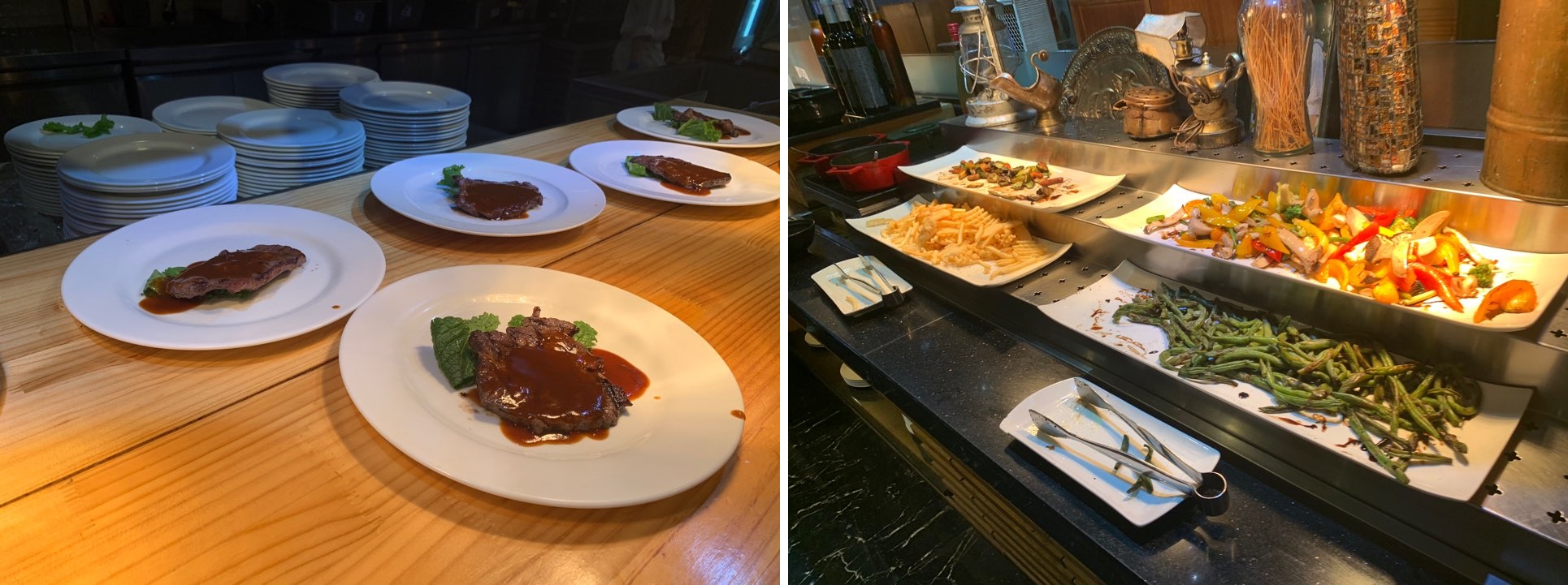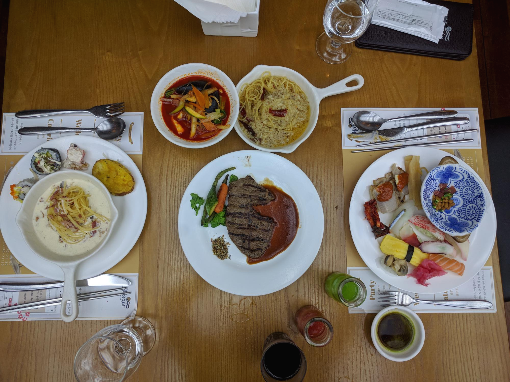 알리오 올리오 파스타와 크림 파스타, 짬뽕 그리고 스테이크를 한번 더 가져왔어요. ㅎㅎ