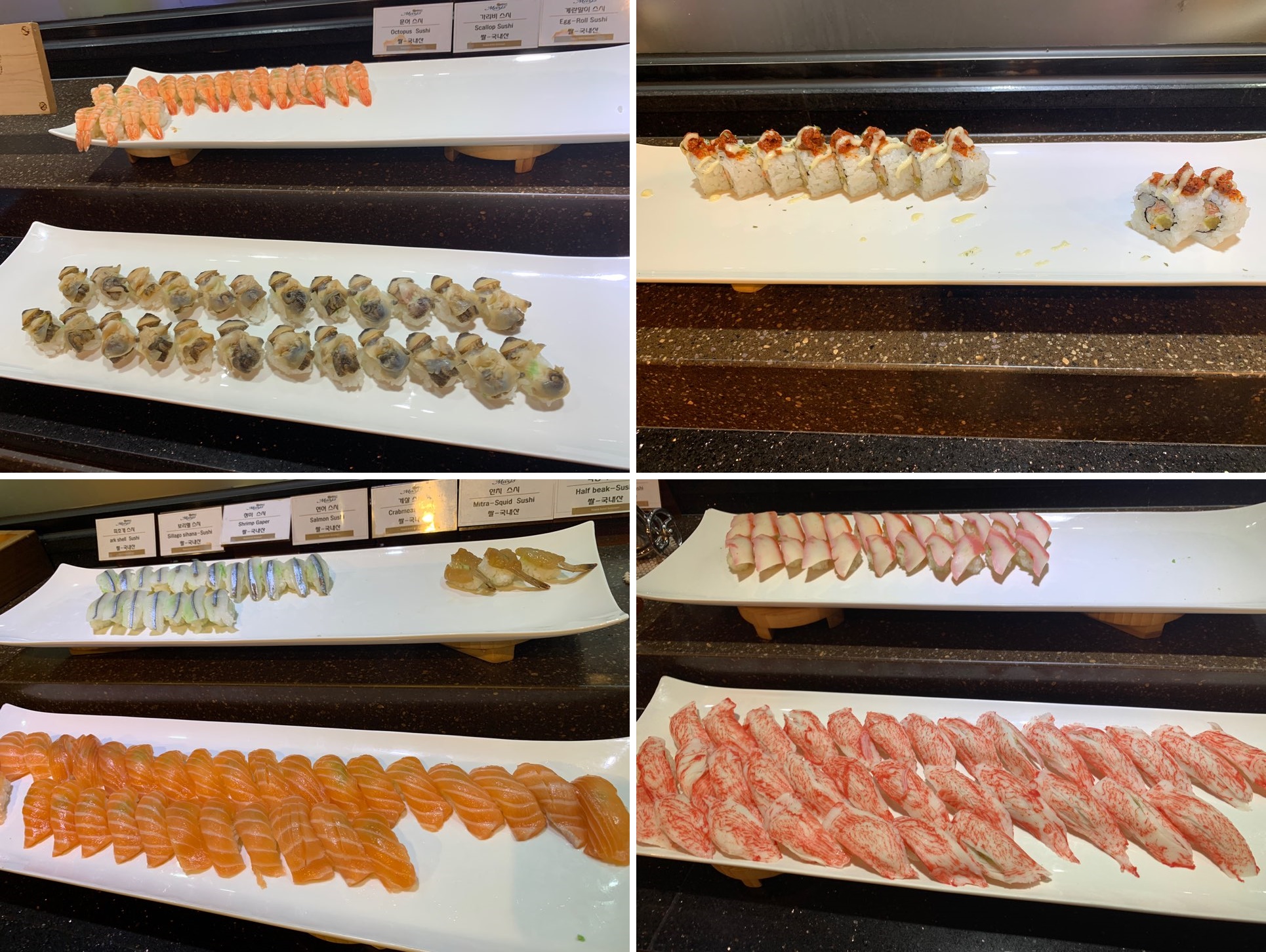 중심에 음식들이 진열되어 있어 양쪽 사이드로 좌석들이 배치되어 있어요.