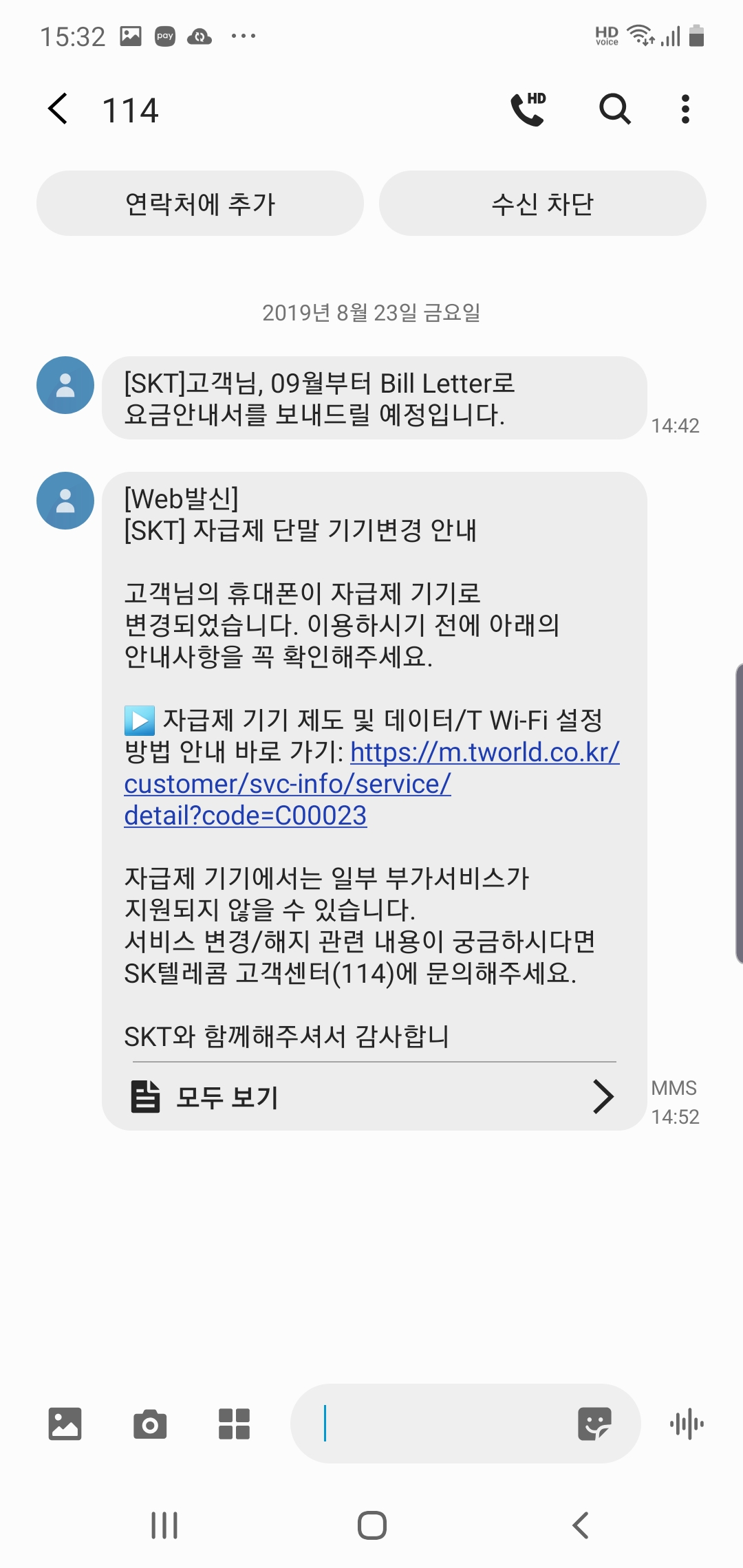 이 과정을 거치면 SKT에서 친절하게 문자가 와요.