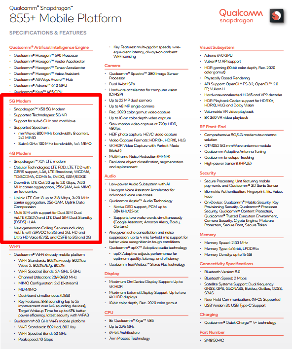 스냅드래곤 855 플랫폼을 보면 5G, 4G, 3G, 2G까지 다양한 모바일 환경을 지원해요.
