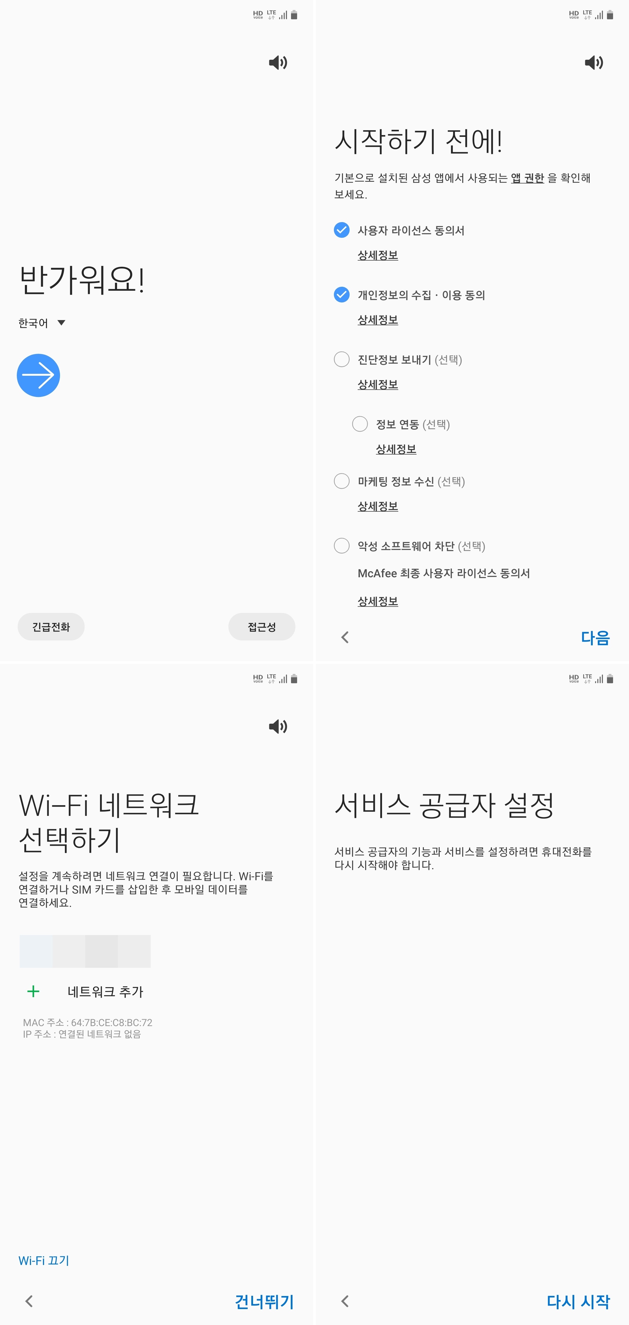 저를 반겨주면서 모바일 네트워크 서비스 공급자 설정을 위해서 다시 시작을 요청해요.