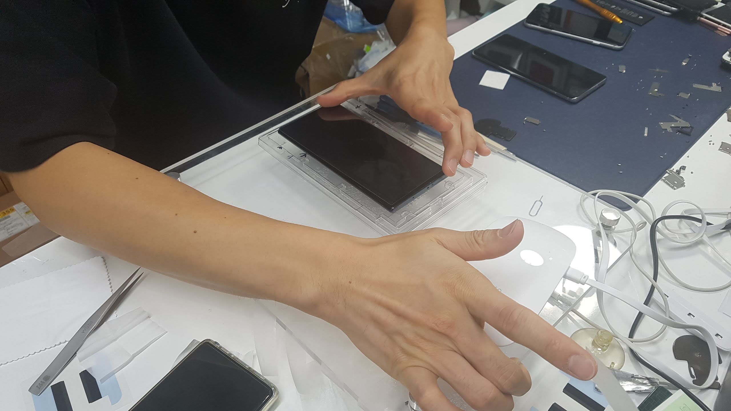 곡면특화점착액을 액정 위에 뿌려줘요.