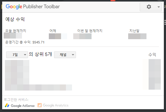 설치가 완료 되면 툴바 창에서 애드센스 수익을 한눈에 확인할 수 있는