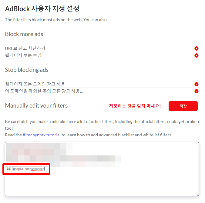 편집을 누르고 박스 안에 '@@||google.com/adsense/'이 부분을 추가해주면 돼요.