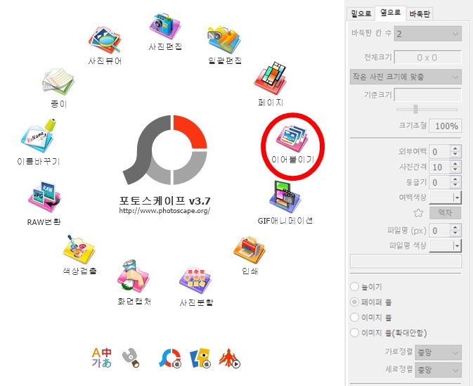 포토스케이프에서 이어붙이기는 밑으로, 옆으로, 바둑판 기능을 가지고 있습니다.