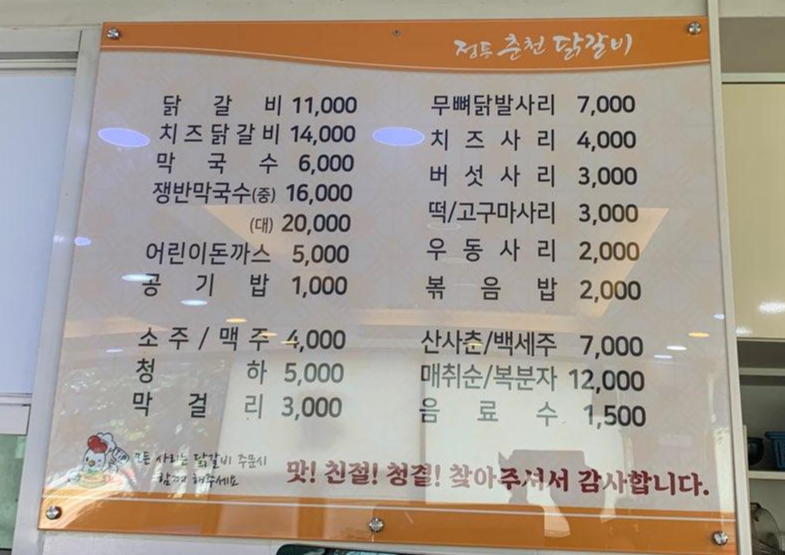 여느 닭갈비 집과 비슷한 메뉴 목록을 가지고 있어요.