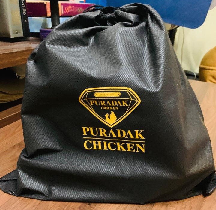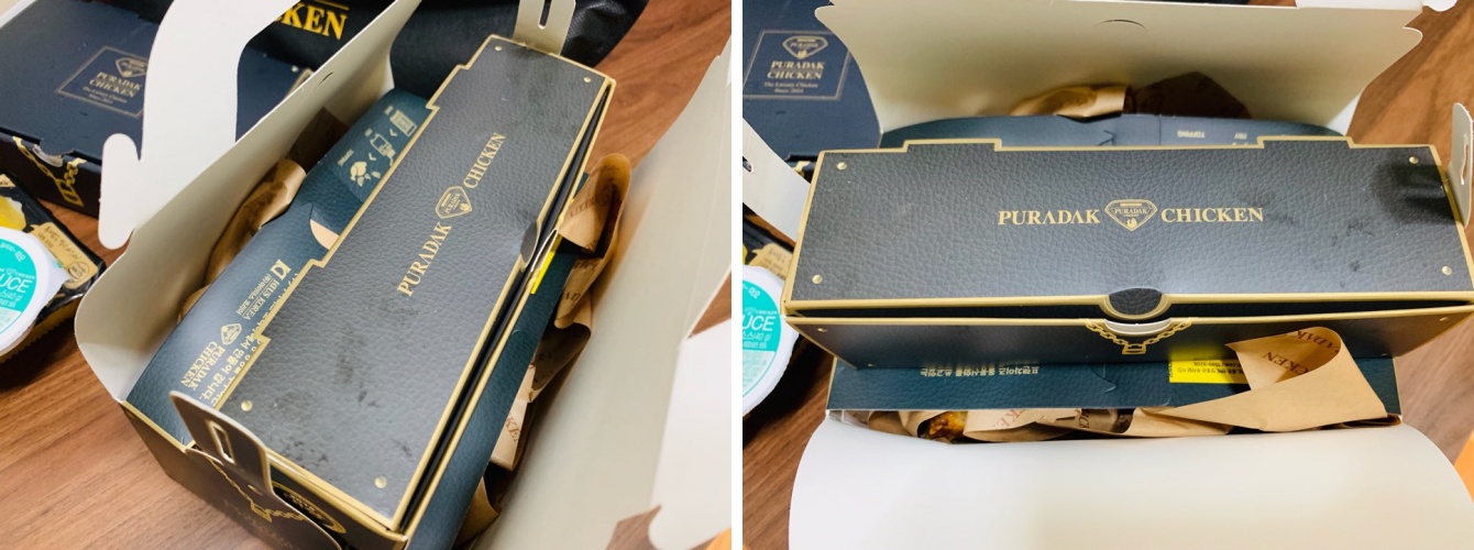 푸라닭의 포장 주머니는 치킨을 포장한 느낌이 안 들게 해요.