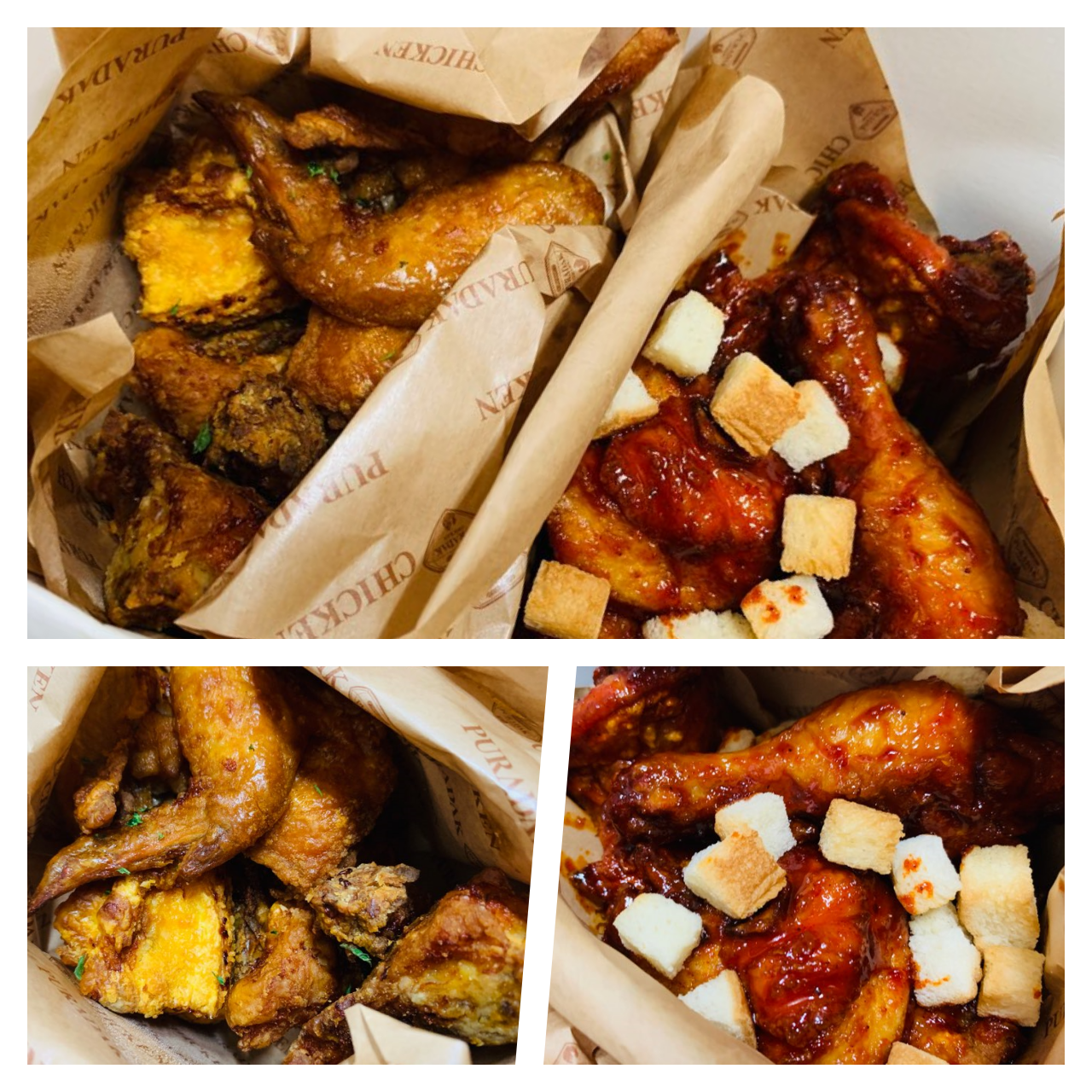 악마 치킨 위에는 식빵 조각이 뿌려져 있었어요.