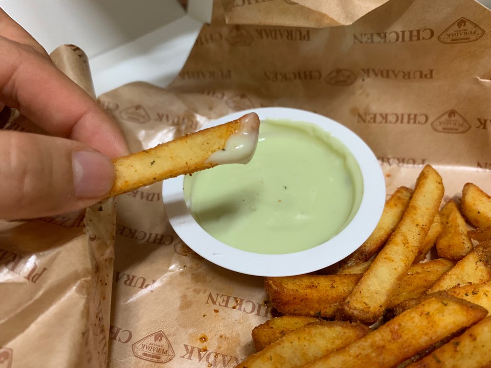 감자 씨즐링을 고추 마요에 살짝 찍어 먹으니 완벽 조합이었어요.ㅎㅎ