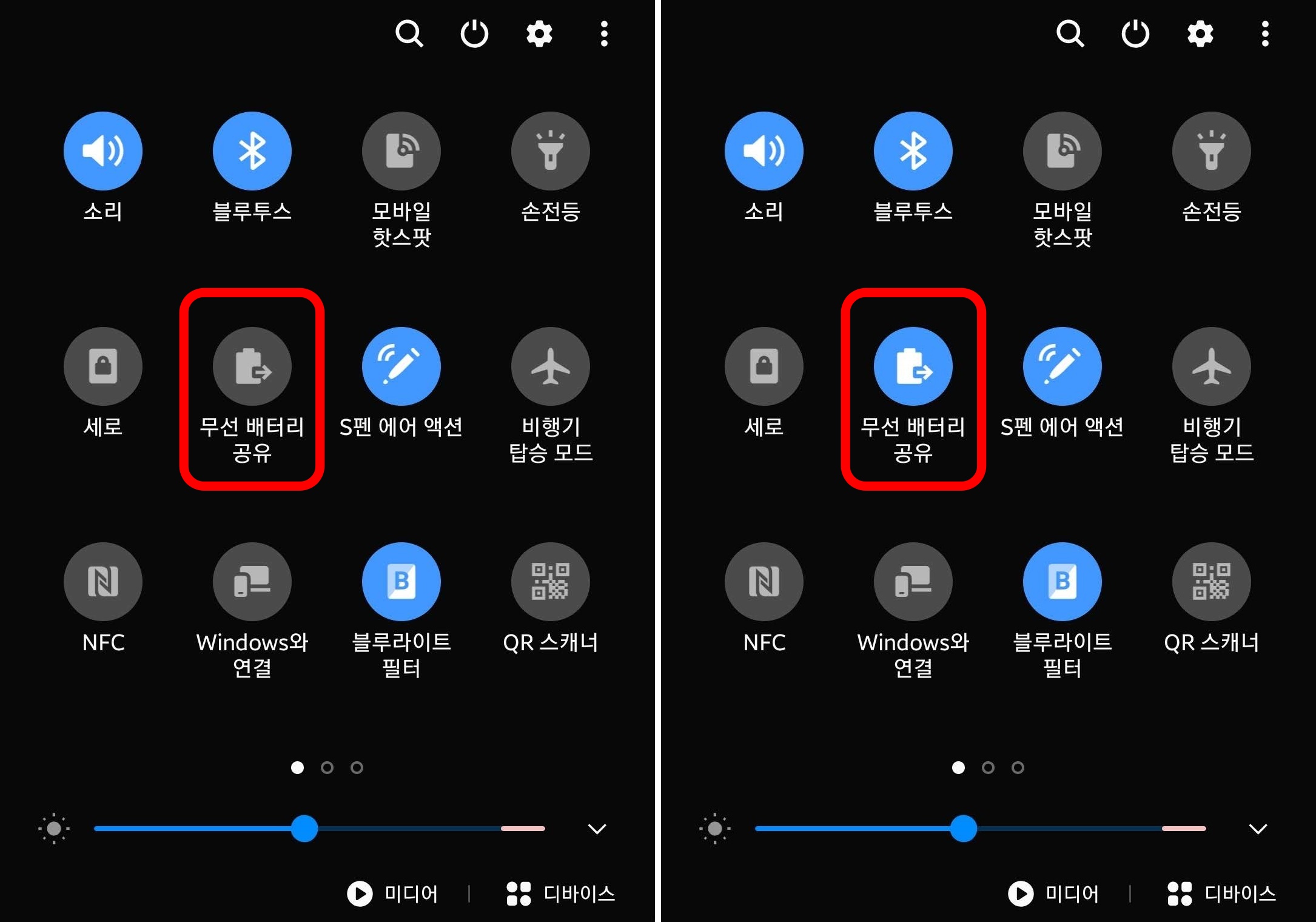 1. 알림창을 내려서 무선 배터리 공유를 선택한다.
