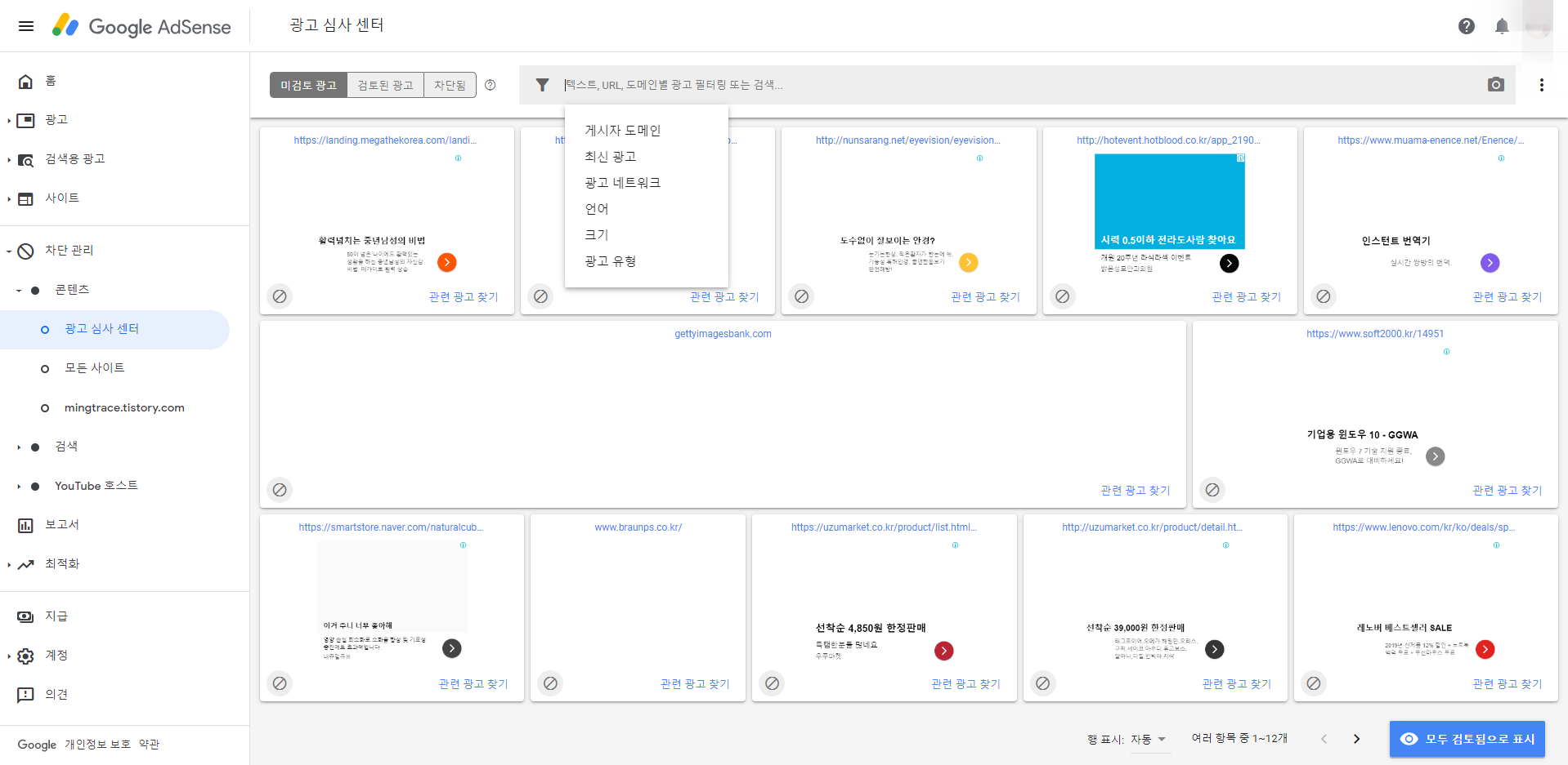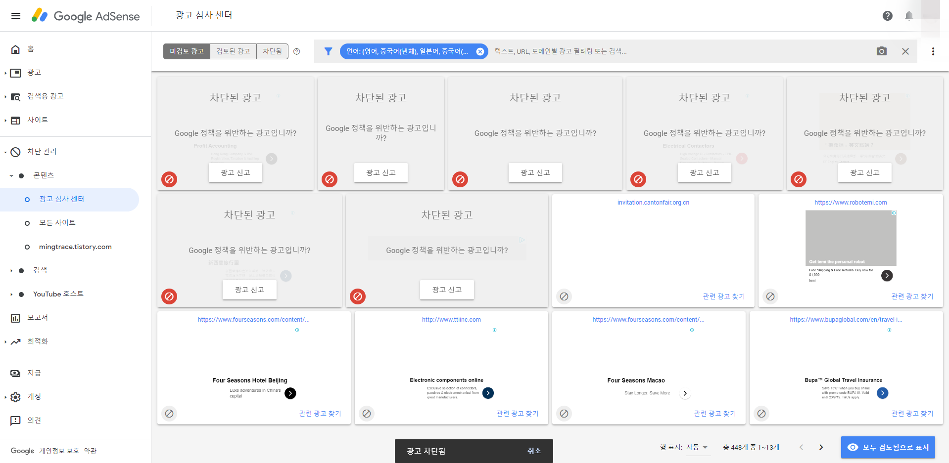 단, 구글 애드센스 광고 심사 센터에서 필터링을 했을 때, 해외 광고가 나오는 것을 확인했습니다.