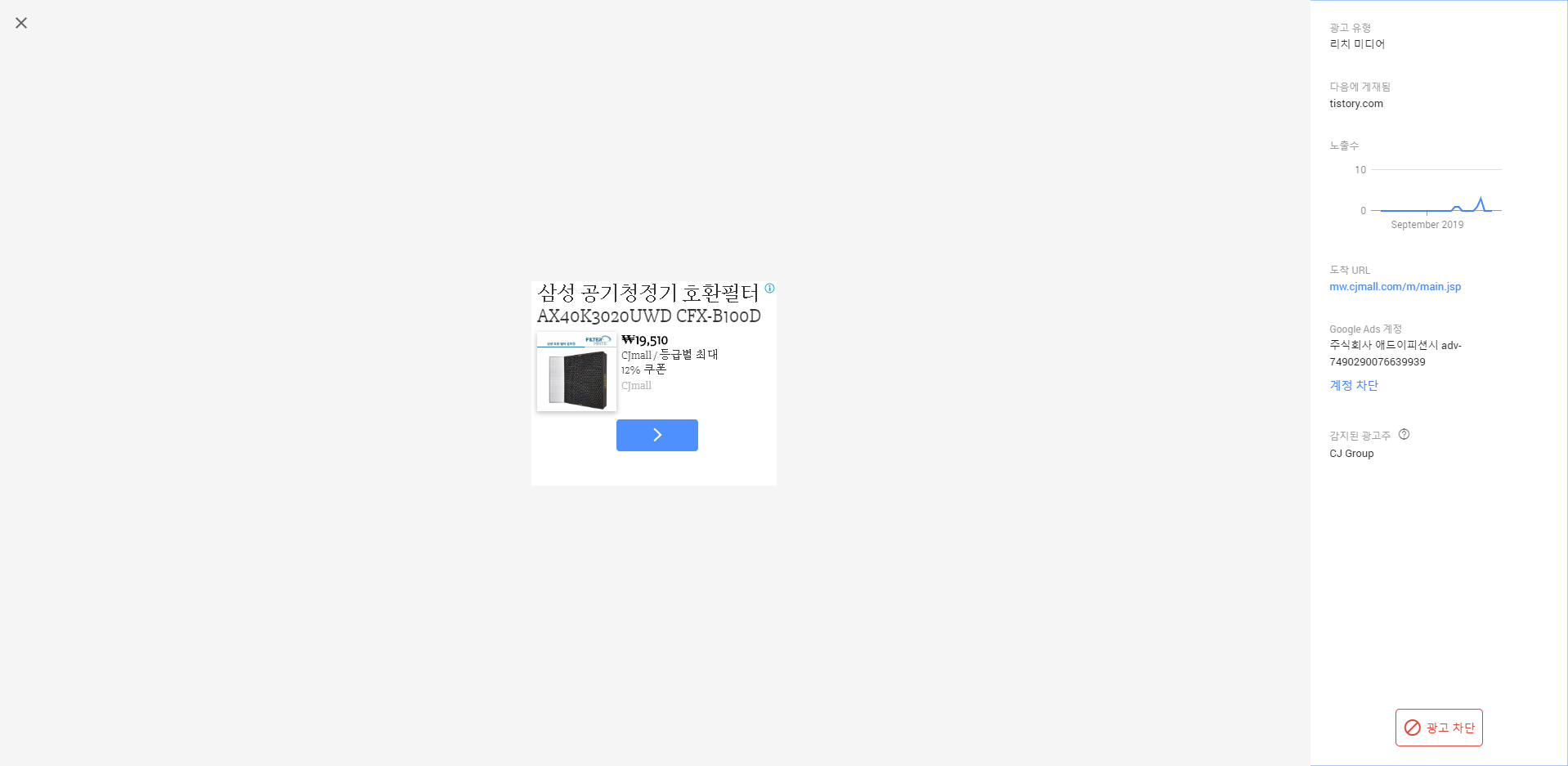 필터를 해서 나오는 광고의 좌측 하단의 차단 버튼을 이용하여 각 광고를 차단해 줍니다.