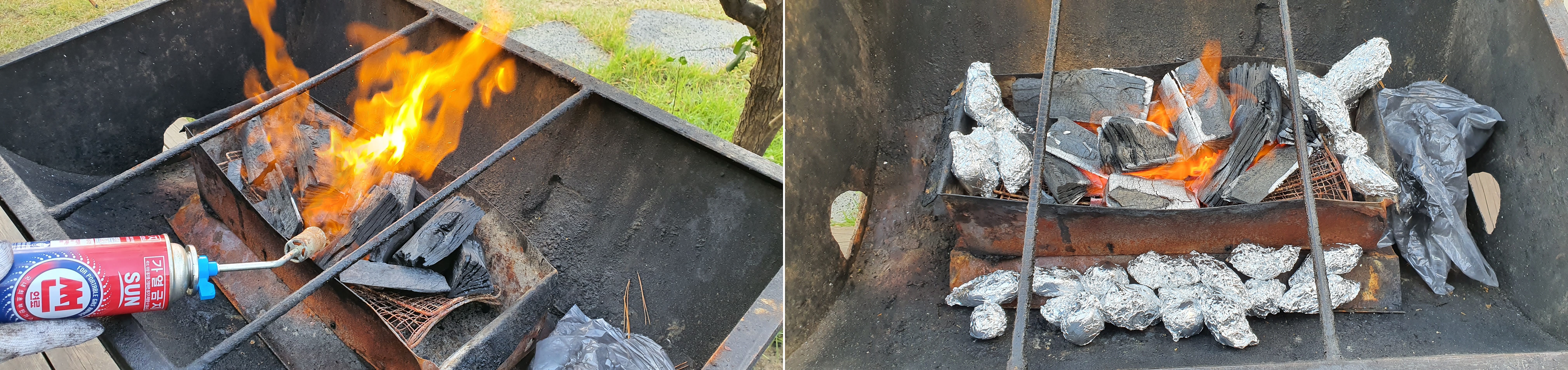 바베큐를 하기 위해서 숯에 불을 붙였어요.