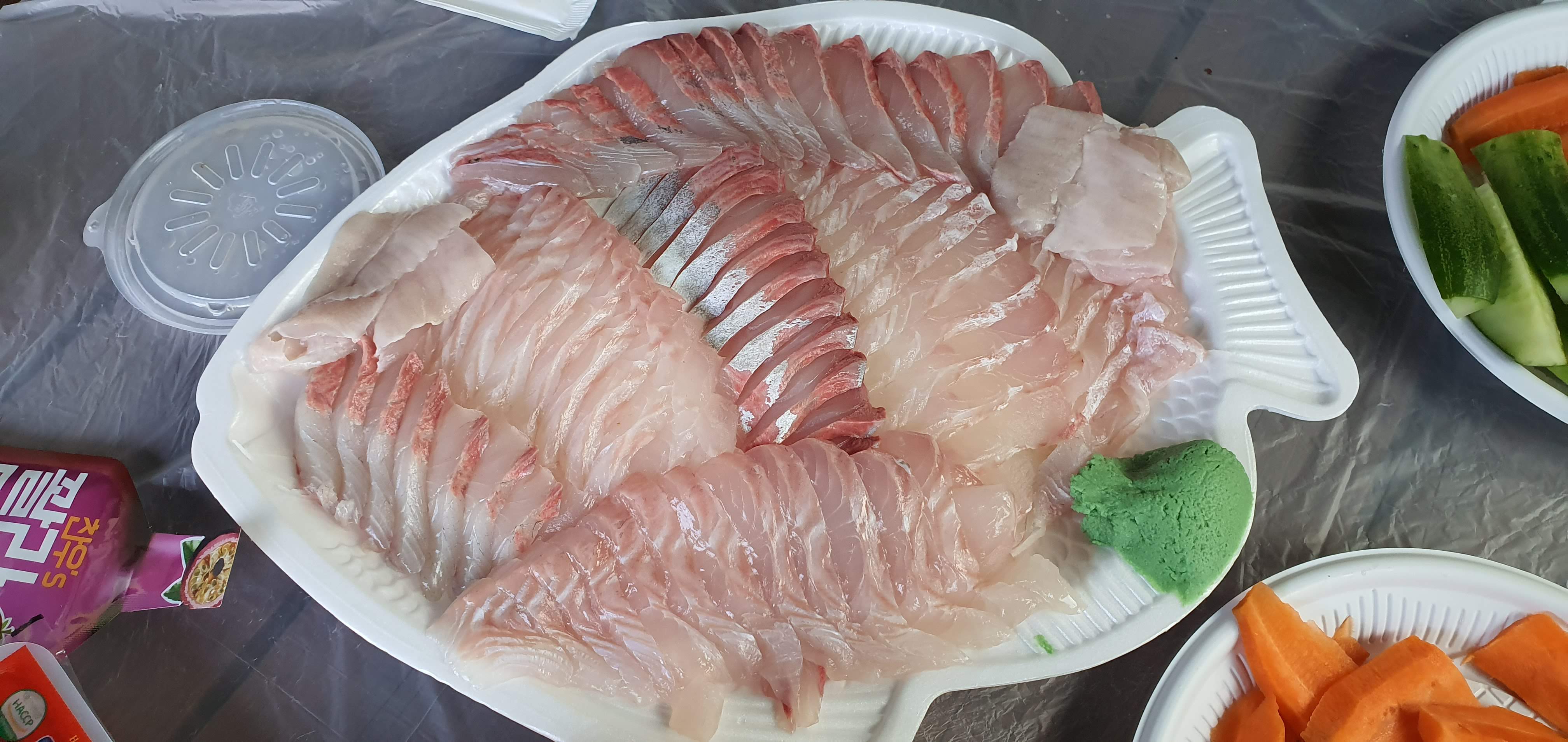 오이도 수산물 직판장에서 사 온 광어, 방어 회가 빛깔도 좋고, 정말 싱싱했어요.