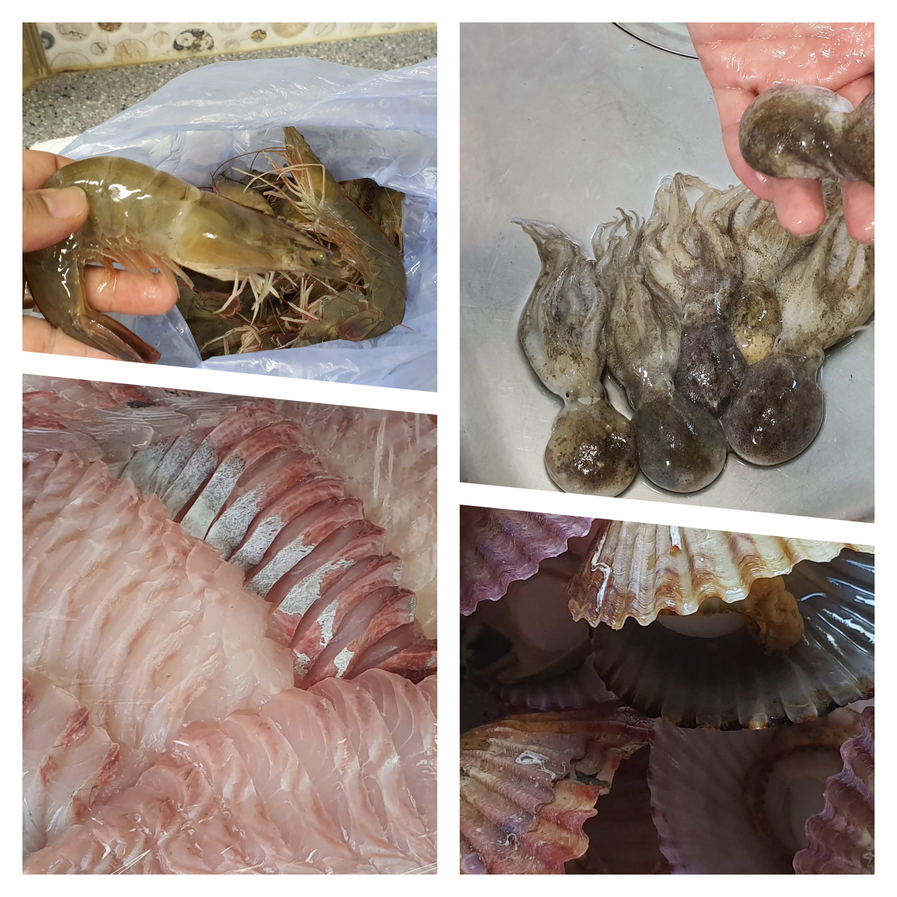 오이도 수산물 직판장에서 대하, 쭈꾸미, 광어, 방어, 가리비, 키조개를 샀어요.