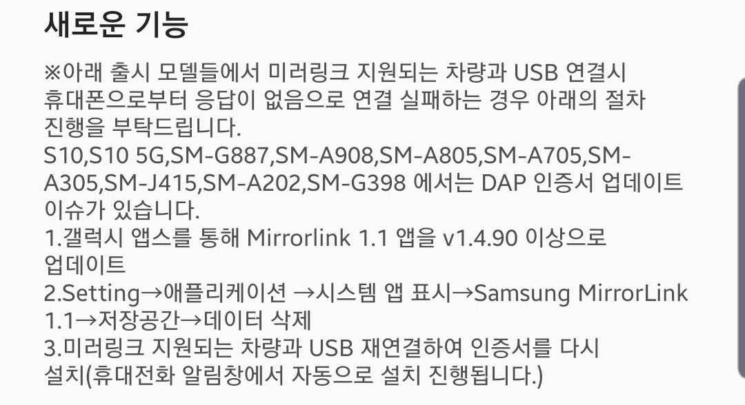 안되나 싶었는데 앱에 미러링크 업데이트가 필요하다고 설명이 나와 있었어요.