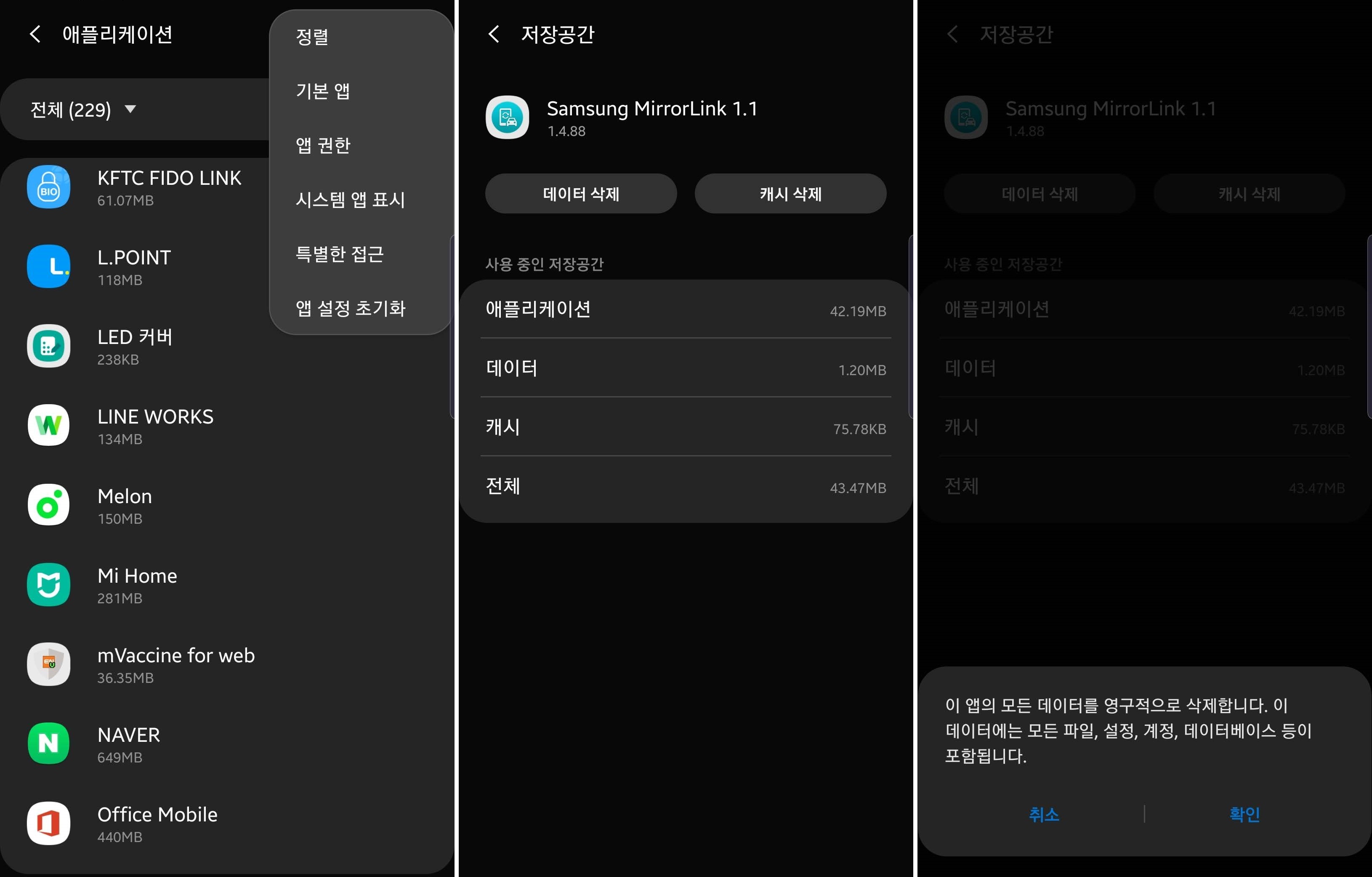 설명대로 애플리케이션에서 시스템 앱을 표시하여 Samsung MirrorLink 1.1을 찾아서 데이터 삭제를 했어요.