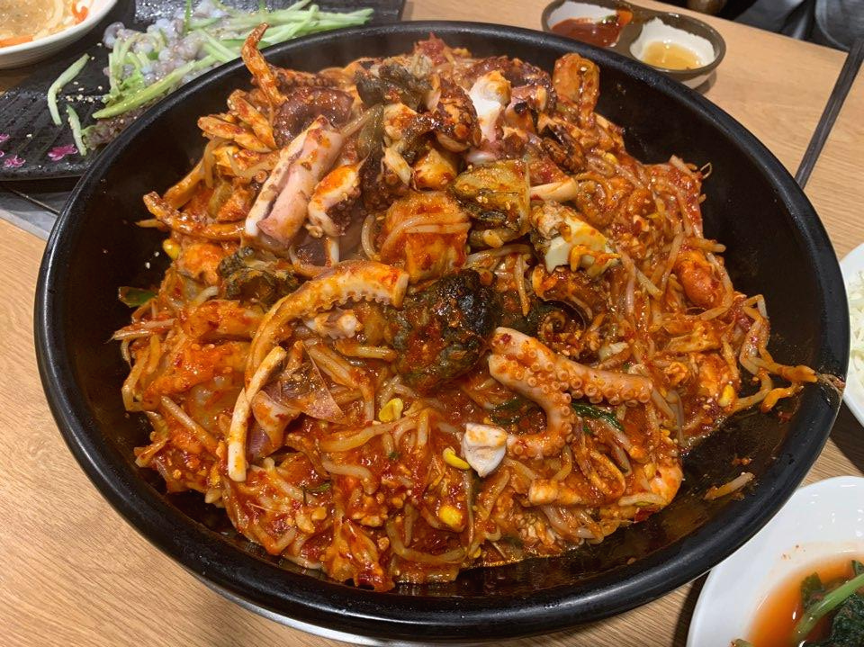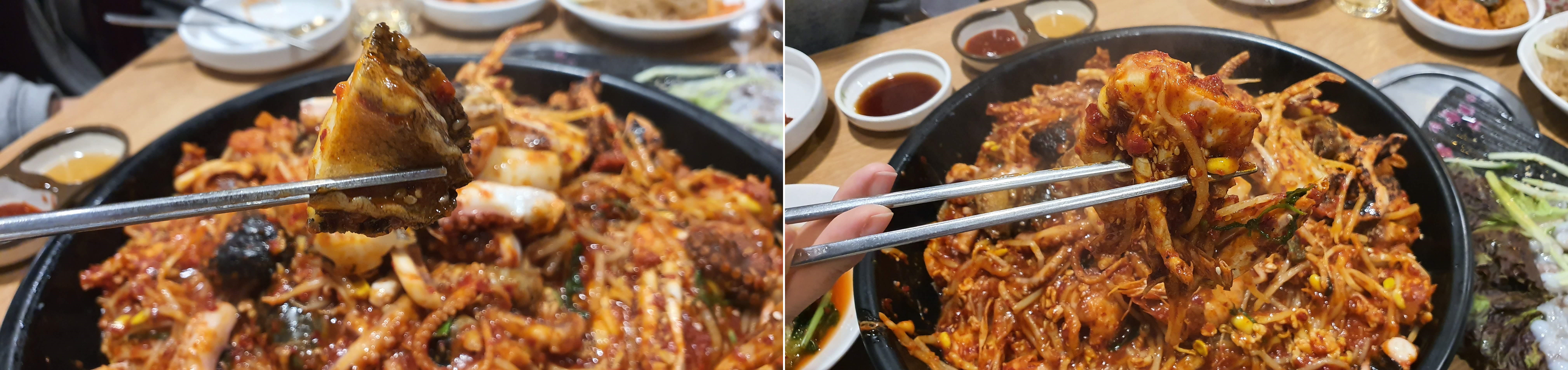 해물찜 안에는 콩나물과 각종 해산물 문어, 전복, 게, 새우, 미더덕 등이 푸짐하게 들어 있었어요.