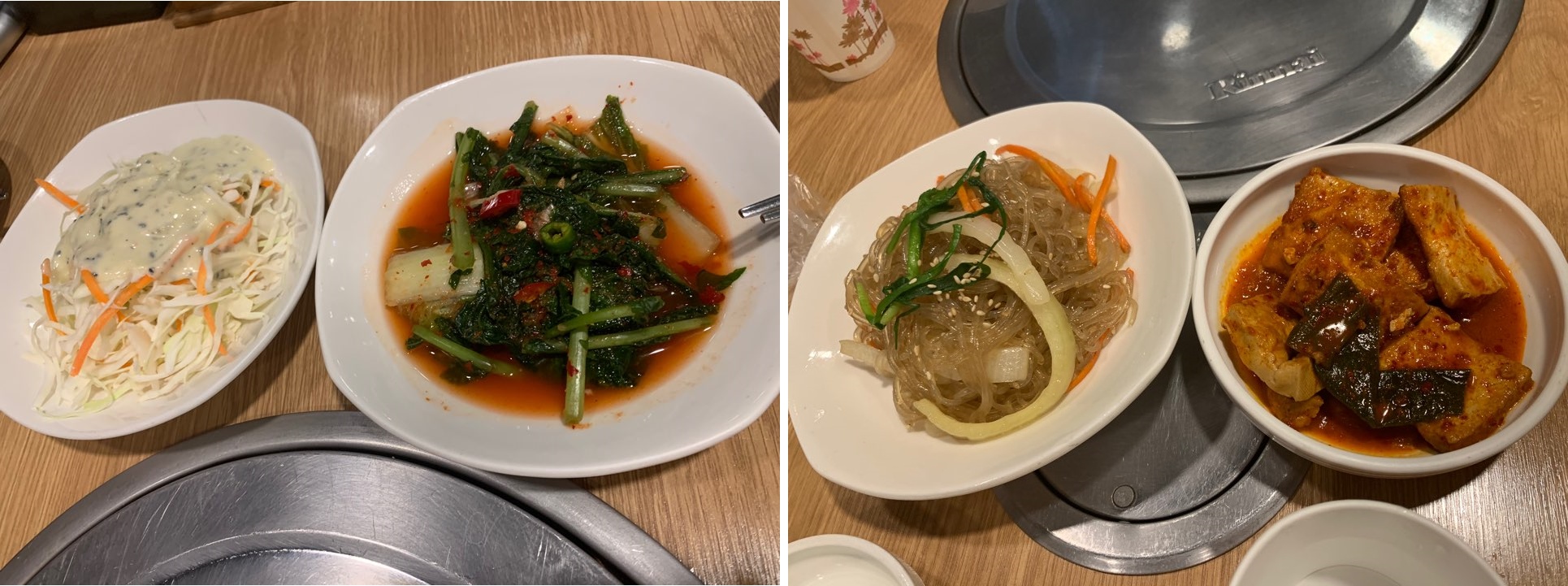 기본 반찬으로 잡채, 두부조림, 열무김치, 양배추 샐러드가 차려져요.