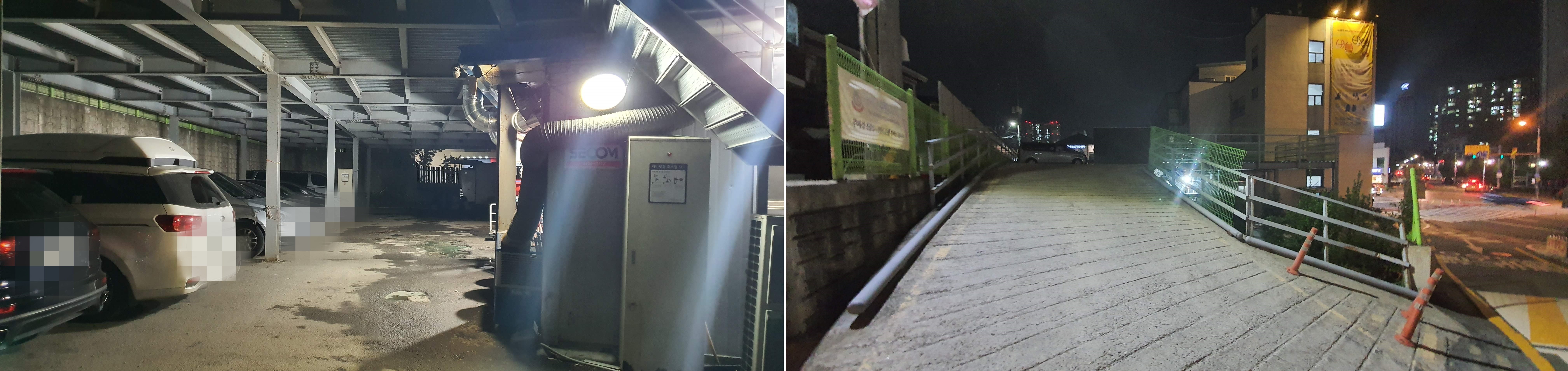건물 옆에는 주차장 1층과 2층이 있어요.