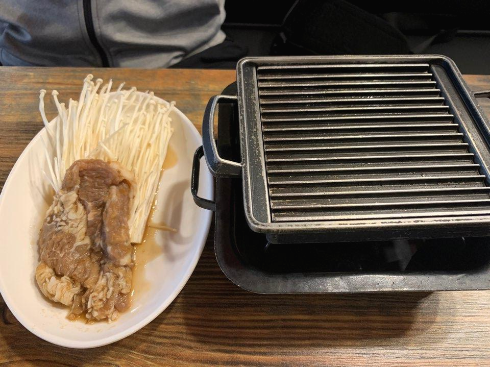 개인용 화로에 차돌을 잘 구워서 쫄면과 함께 먹어줘요. ㅎㅎ