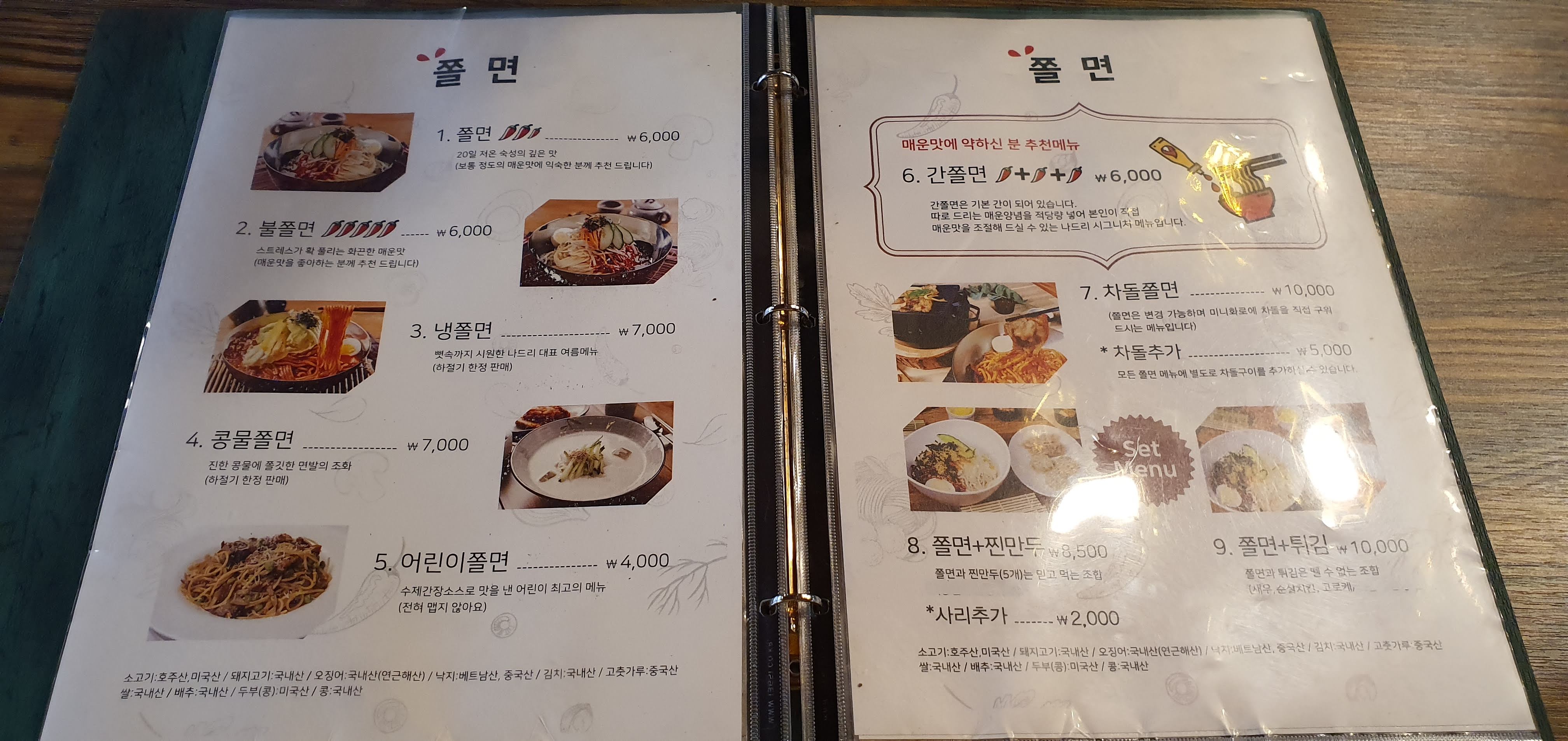 쫄면 메뉴로 총 9가지가 있었어요.