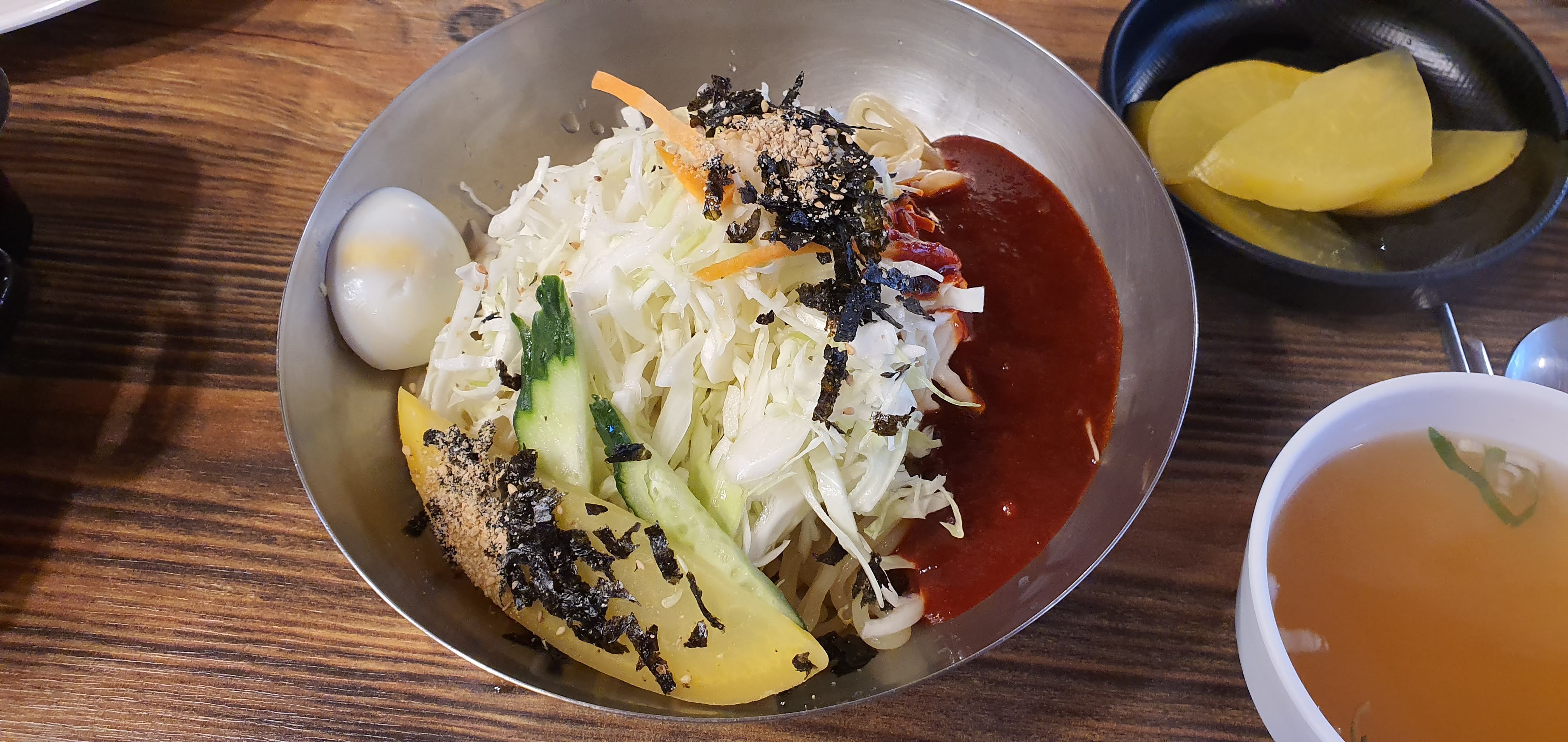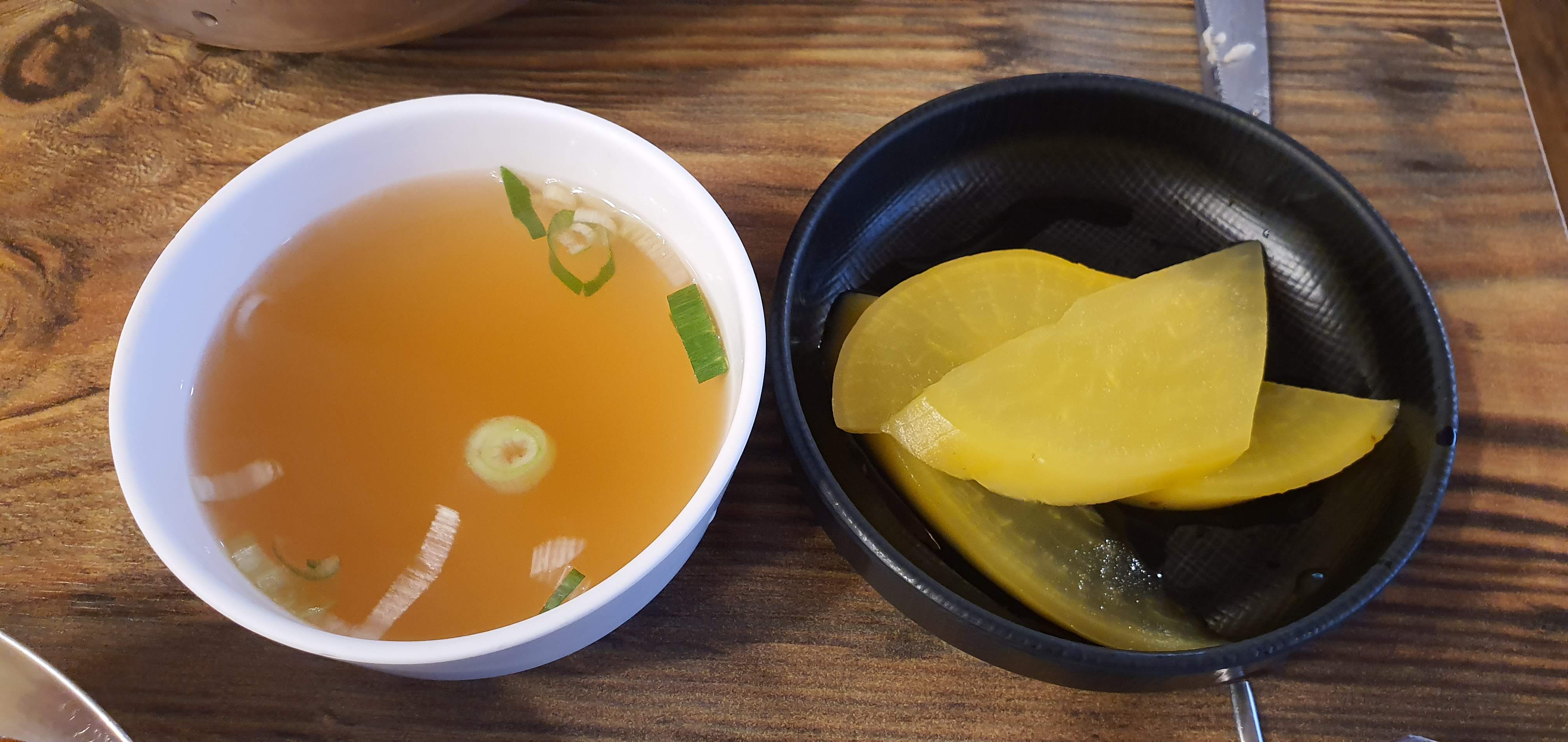 기본 찬은 단무지와 국물이에요.
