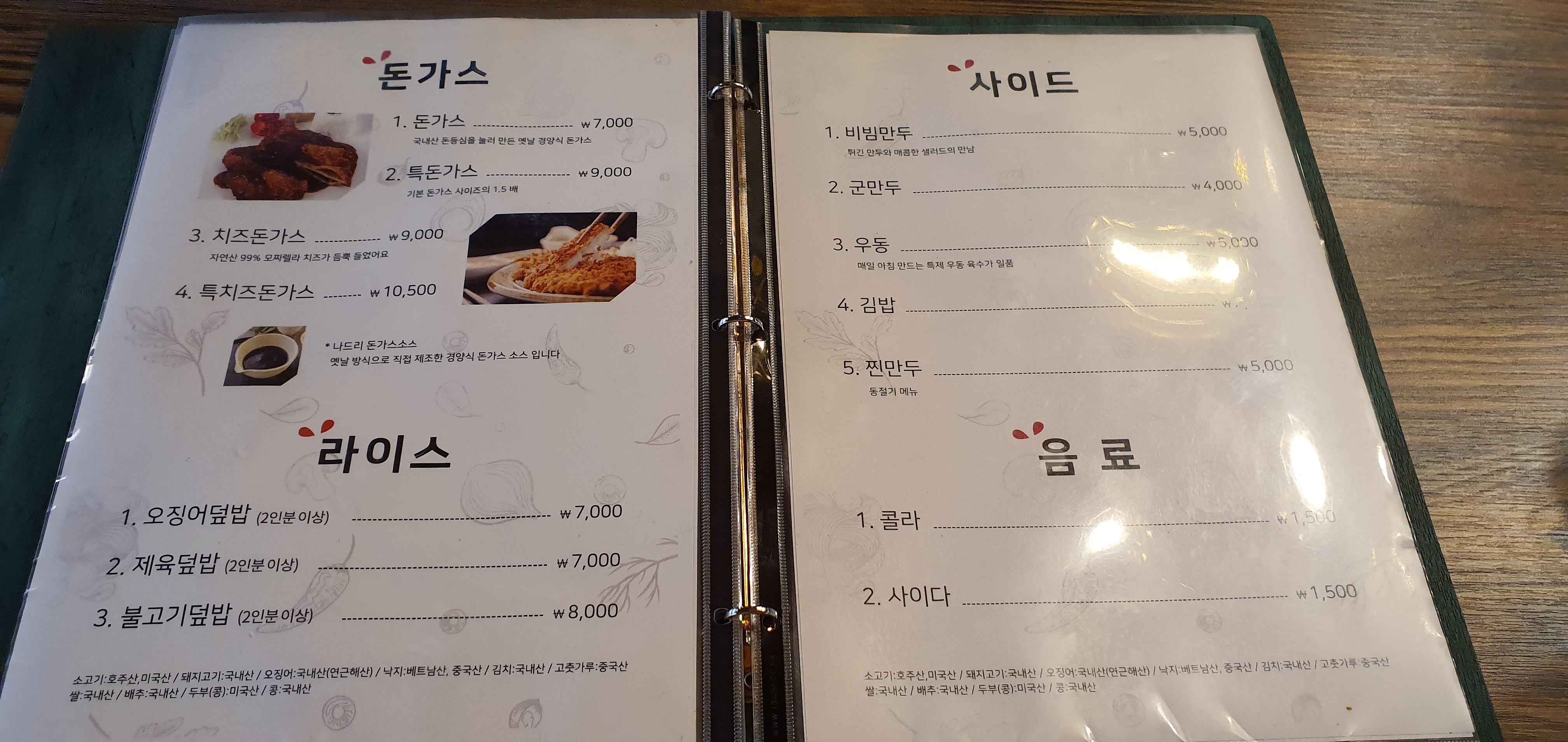 그리고 돈가스와 라이스, 사이드 메뉴, 음료가 있어요.