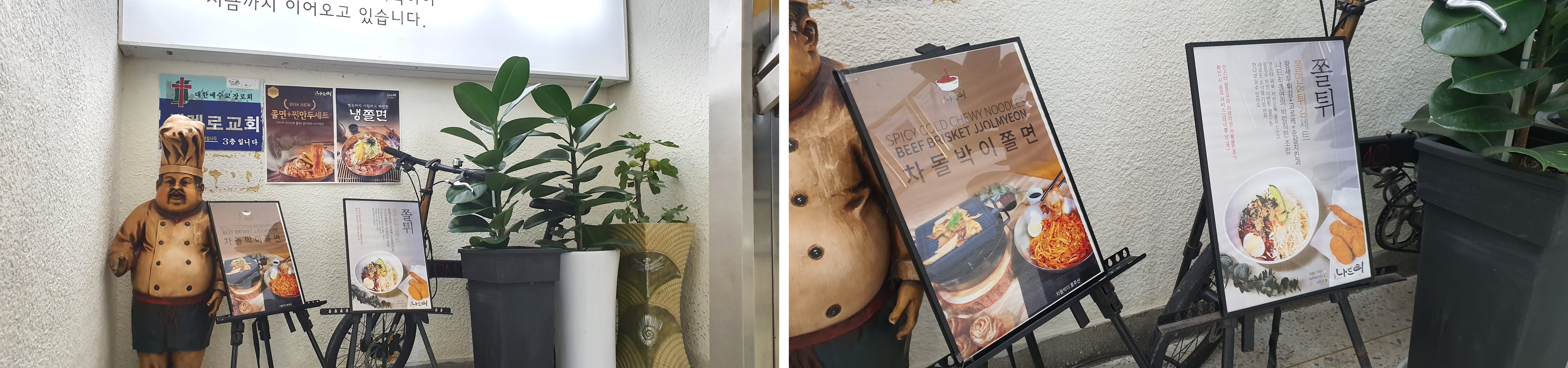 계단 중간에는 나드리 쫄면 메뉴중에 차돌박이 쫄면과 쫄튀, 쫄면+찐만두 세트, 냉쫄면을 소개하고 있었어요.