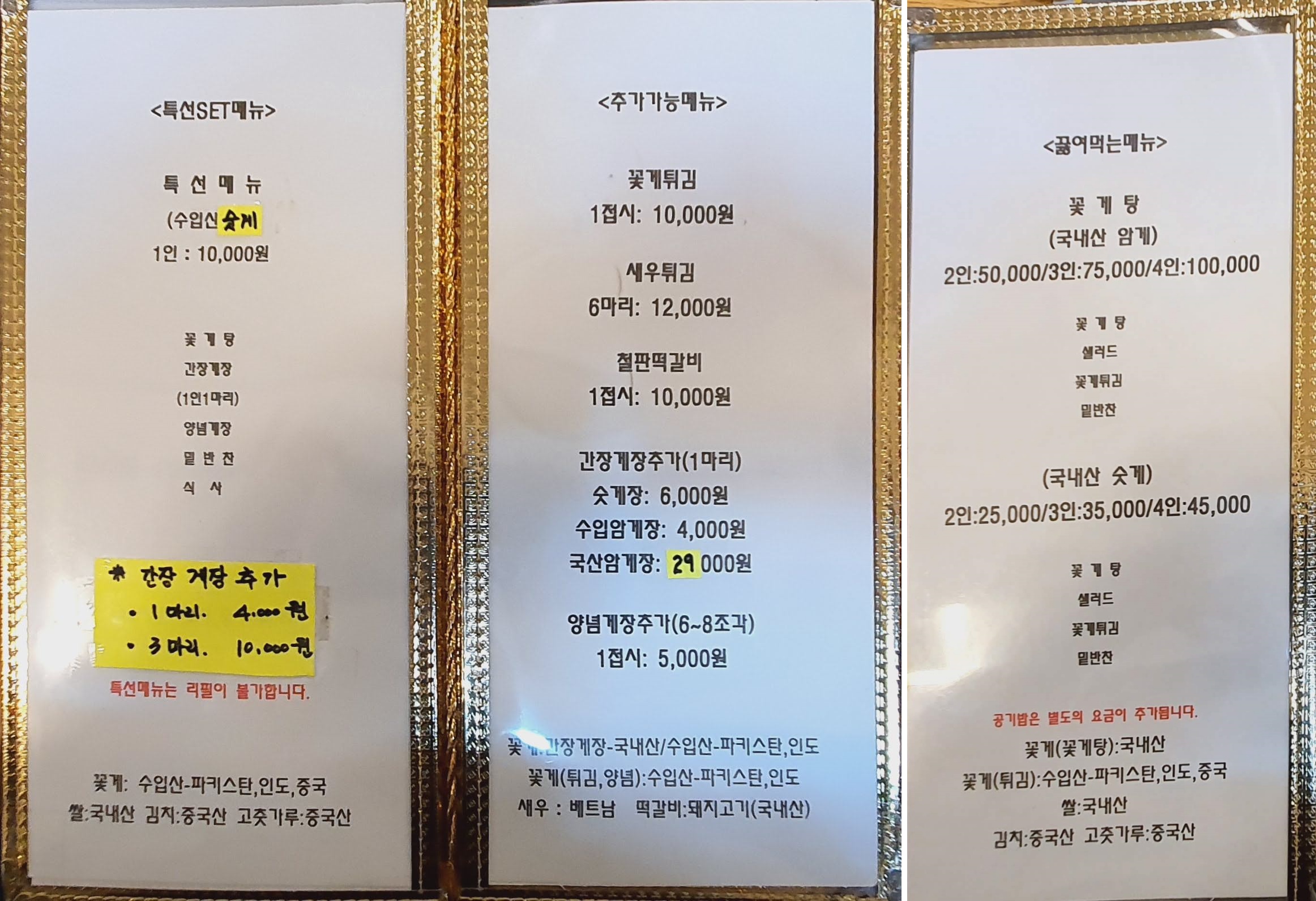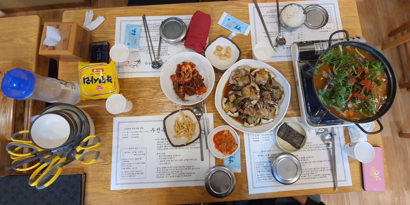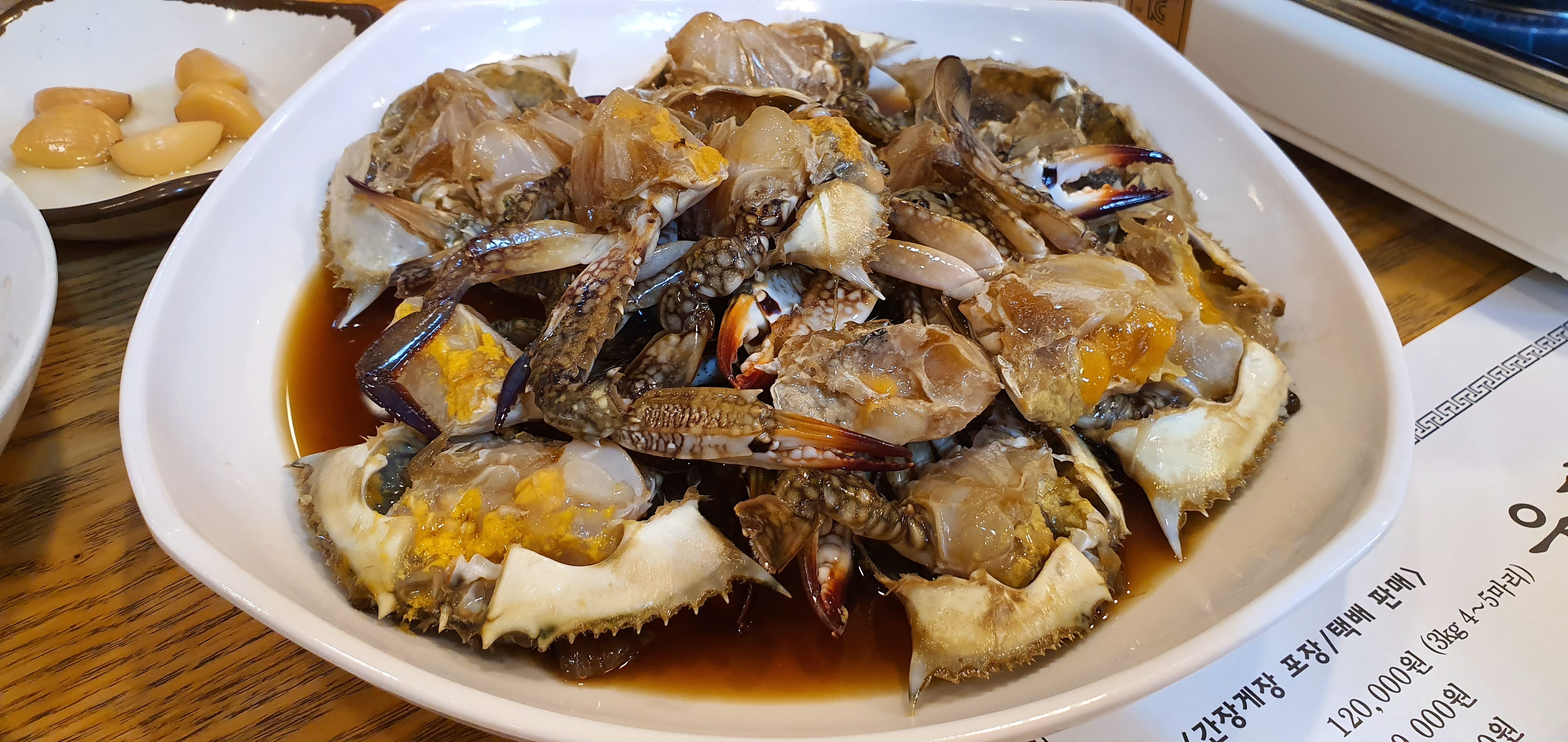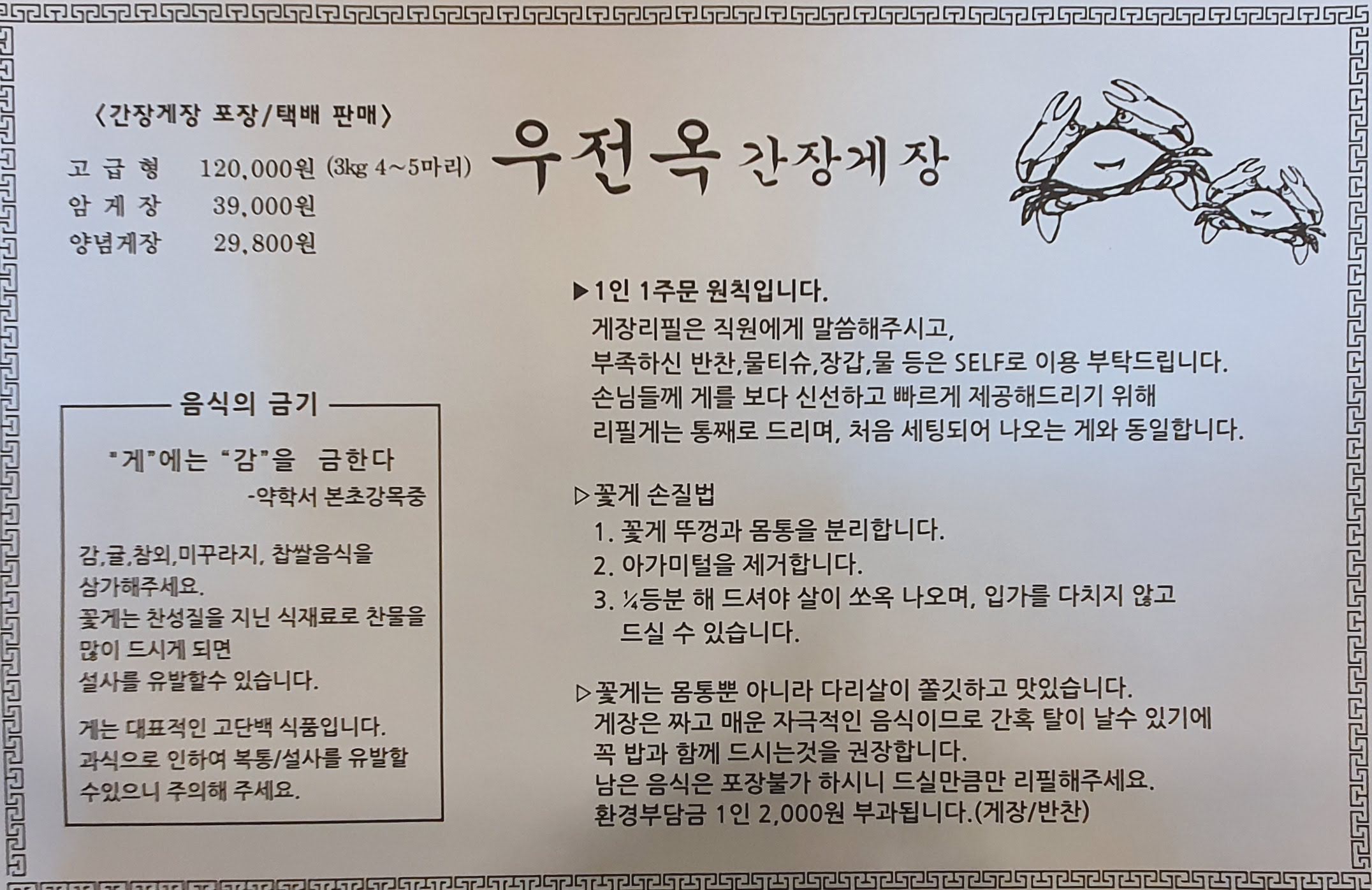 테이블 위에는 우전옥 간장게장에 주문 관련 설명과 포장/택배 판매 정보, 꽃게를 손질하여 먹는 법과