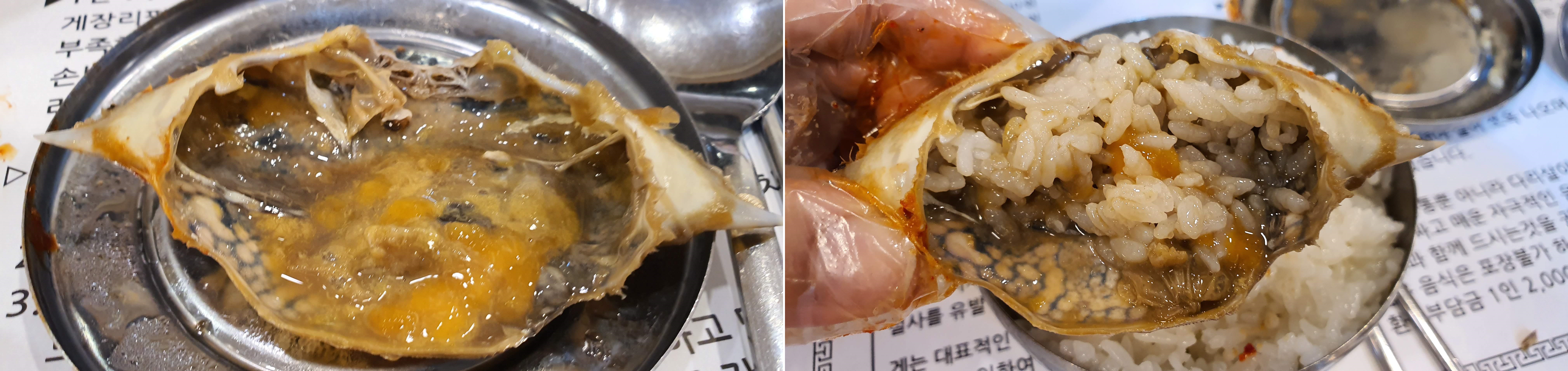 그리고 게 뚜껑에는 살살 긁어서 밥을 얹어서 싹 긁어먹는 맛이 있죠. ㅎㅎ
