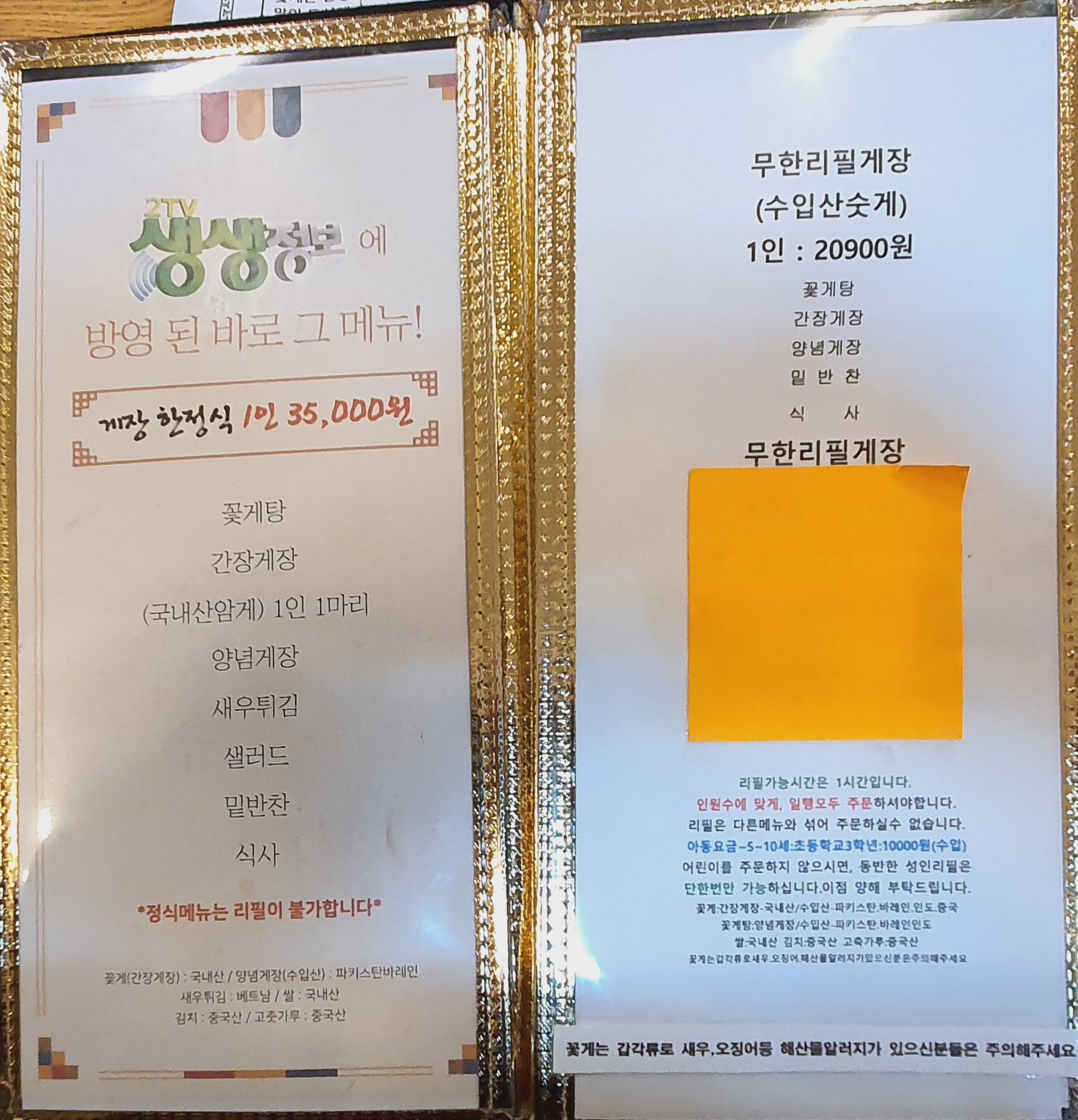 무한 리필과의 차이는 간장게장이 국내산 암게이고 새우튀김, 샐러드의 차이가 있는 듯해요.