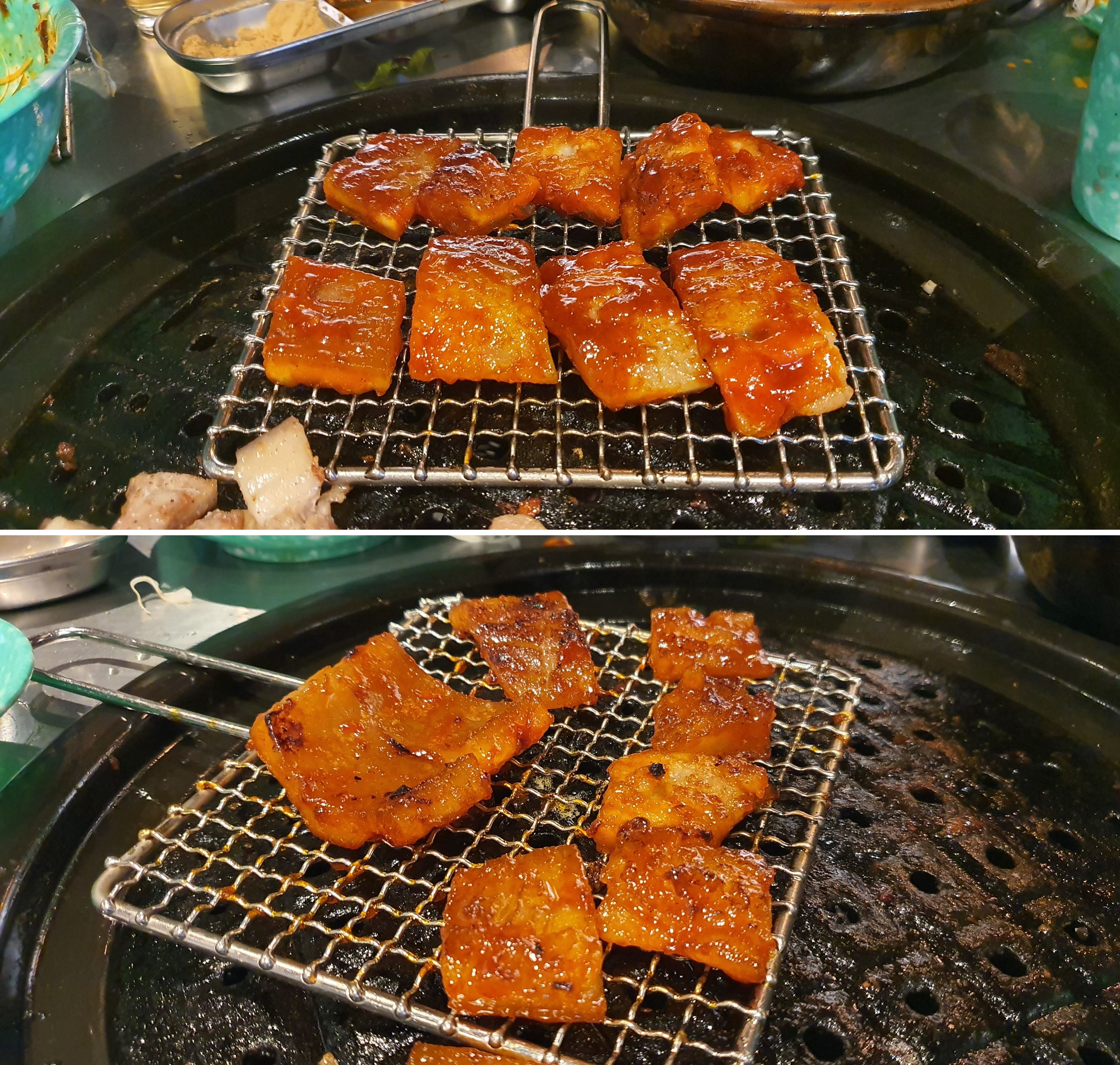 눈물 껍데기는 양념이 묻어 있어서 불판에 바로 굽으면 안 되고 별도의 석쇠 위에 올려서 구워야 해요.